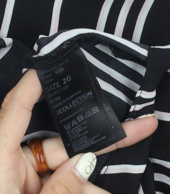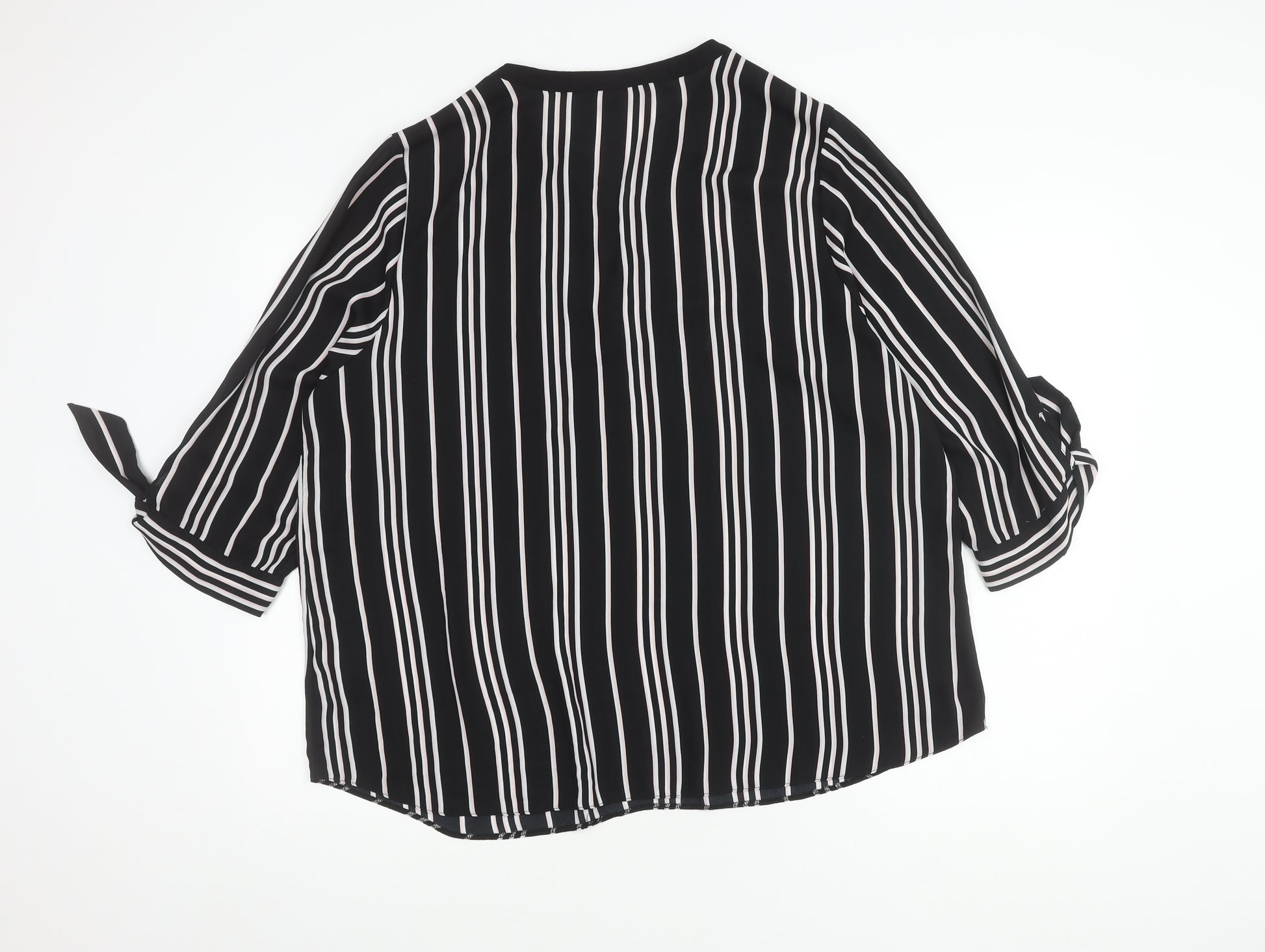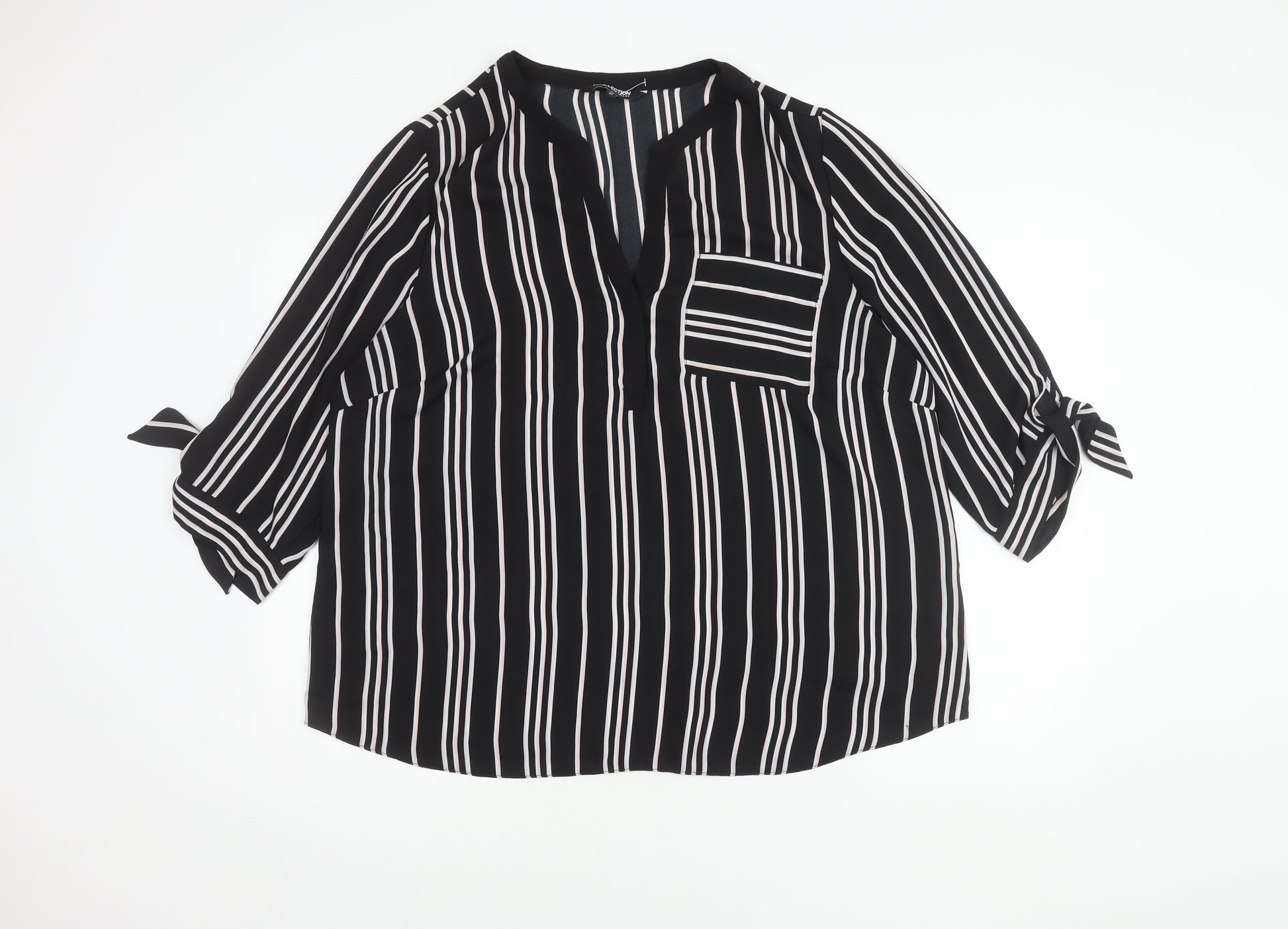 Elevate your wardrobe with this classic black and white striped blouse from Debenhams. Crafted for women who appreciate both style and comfort, this blouse is available in size 20, catering specifically to plus-sized fashion enthusiasts. Its design features a versatile striped pattern, perfect for adding a touch of sophistication to any casual ensemble.Made from high-quality polyester, this blouse promises durability and a lightweight feel, ensuring comfort throughout the day. The woven fabric type further enhances its easy-care properties, making it a practical addition to your wardrobe. The V-neckline adds a flattering touch, complemented by 3/4 length roll tab sleeves, which give you the option to adjust according to your preference and style.This piece embodies a regular fit, allowing for effortless pairing with both tailored trousers for a business-casual look or jeans for a more relaxed vibe. The button accents contribute a modern flair, while also serving as a functional element of the blouse's design. Ideal for casual occasions, this top is perfect for all seasons, easily transitioning from autumn to summer when layered accordingly.Machine washable for added convenience, this blouse is as easy to maintain as it is to wear. Although it is not brand new, it remains in excellent condition, carefully maintained with no visible signs of wear, ensuring it can be a staple in your collection for years to come.Make a smart wardrobe choice with this Debenhams blouse – it's the perfect blend of style, comfort, and affordability.