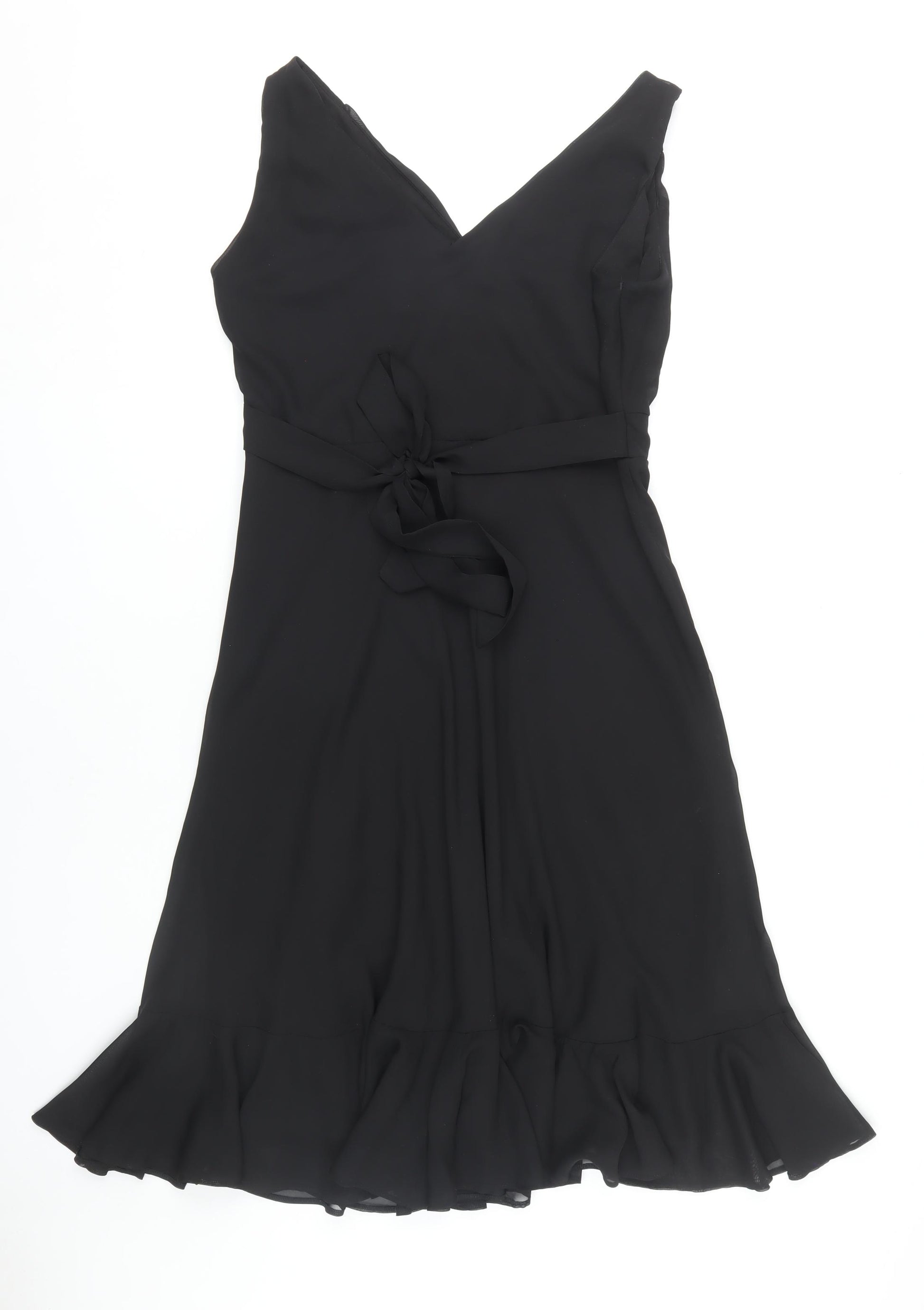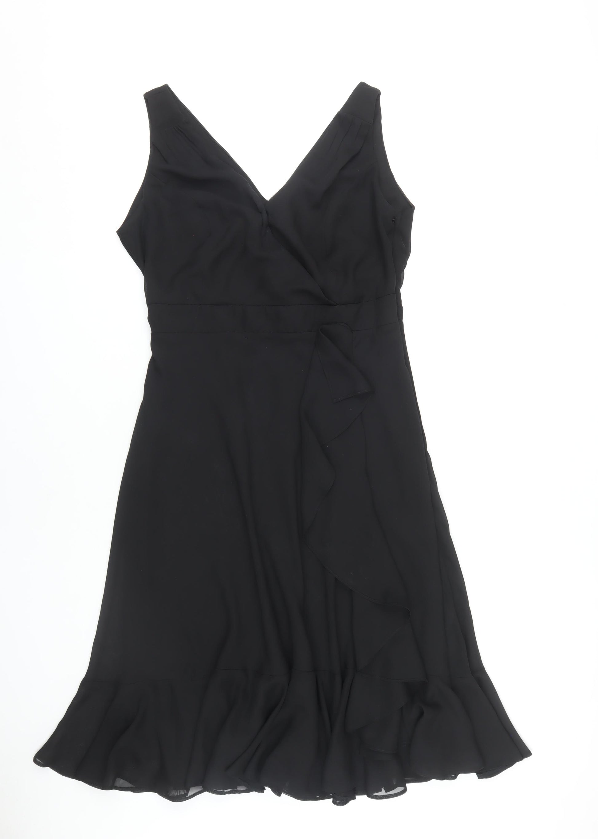 This elegant black wrap dress from Debenhams is a sophisticated choice for any formal or cocktail occasion. Crafted from 100% polyester, its woven fabric offers a lightweight and comfortable fit. The knee-length design features a flattering V-neckline and sleeveless cut, perfect for showcasing your style at any event. With its ruffle accents, this dress adds a touch of flair to a classic wrap style. Suitable for regular sizing, this dress ensures effortless appeal with its tie closure for a perfect fit. Machine washable for easy garment care, this dress is in excellent condition with no visible wear or damage. Upgrade your wardrobe with this timeless piece that promises elegance and charm in every wear.