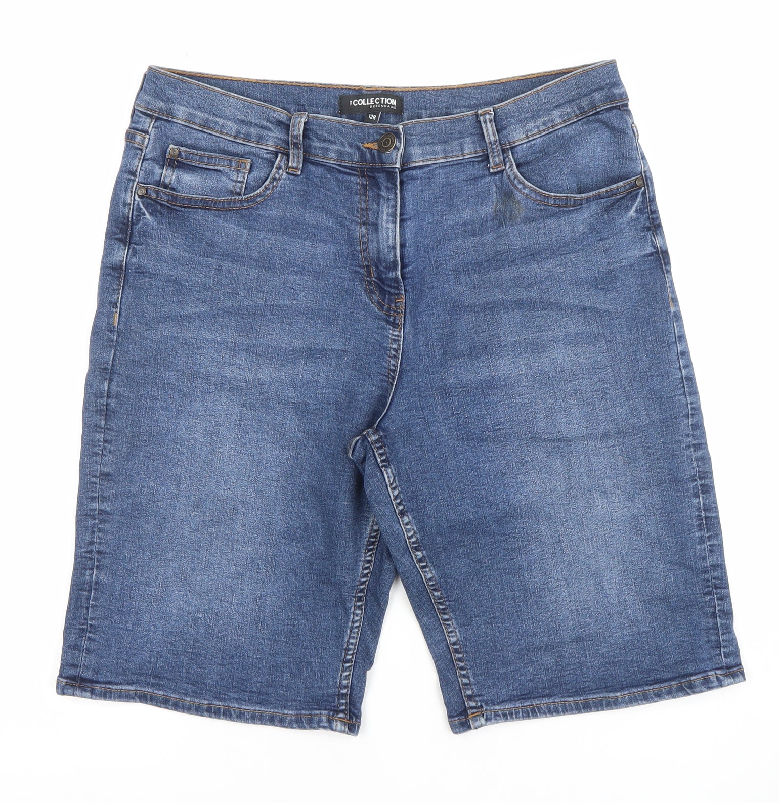 Add a classic summer staple to your wardrobe with these Women’s Blue Bermuda Denim Shorts from The Collection by Debenhams. Crafted in a mid-wash blue tone, these shorts feature a simple yet flattering Bermuda cut, designed to sit comfortably at mid-rise and fall just above the knee, perfect for warm casual days. Made from a soft and durable blend of 82% cotton, 17% polyester and 1% elastane, they provide just the right amount of stretch for ease of movement without losing their shape. The five-pocket design offers a timeless denim look with practical storage for your everyday essentials, while the button and zip fastening provides a secure, comfortable fit. These shorts have a regular fit and are crafted from soft denim fabric that is easy to care for and beautifully breathable, making them an ideal everyday choice. Whether you pair them with a linen blouse, tank top or light jumper, their versatile design ensures they can be dressed up or down with ease. Great for relaxed weekends, seaside walks or casual outings, they keep you cool while maintaining an effortlessly stylish look. The medium wash gives them a flattering finish that works well across all seasons. In excellent pre-loved condition with only minimal signs of wear, these shorts are ready to become a reliable piece in your warm-weather rotation. Perfect for women who value quality, comfort, and timeless style.