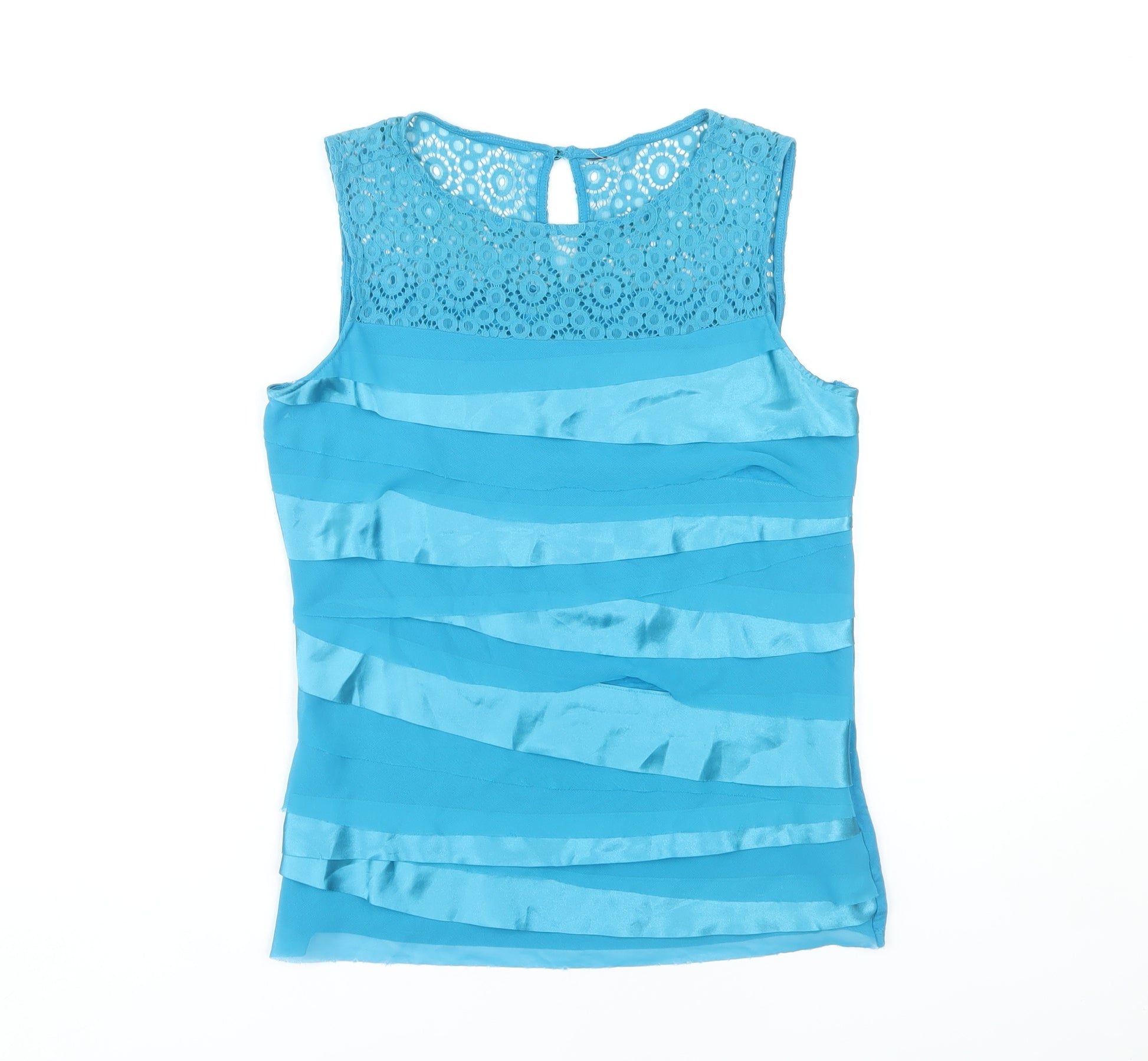 Add a touch of elegance to your wardrobe with this vibrant blue blouse from Debenhams. Perfect for women who appreciate casual sophistication, this sleeveless top is crafted from a comfortable blend of viscose and elastane, providing a classic fit with a hint of stretch that flatters your silhouette beautifully. The blouse features a delicate crochet accent at the neckline, adding a detail of femininity and charm. Designed for petites, this size 10 blouse is ideal for spring and summer wear. Its solid pattern and timeless style make it a versatile piece that pairs effortlessly with both skirts and jeans. Whether for a casual outing or a day at the office, this blouse is your go-to choice for a simple yet stylish look. Easy to care for and machine washable, it's a practical addition to your clothing collection. Don't miss this opportunity to own a stylish piece from Debenhams that combines quality and style.