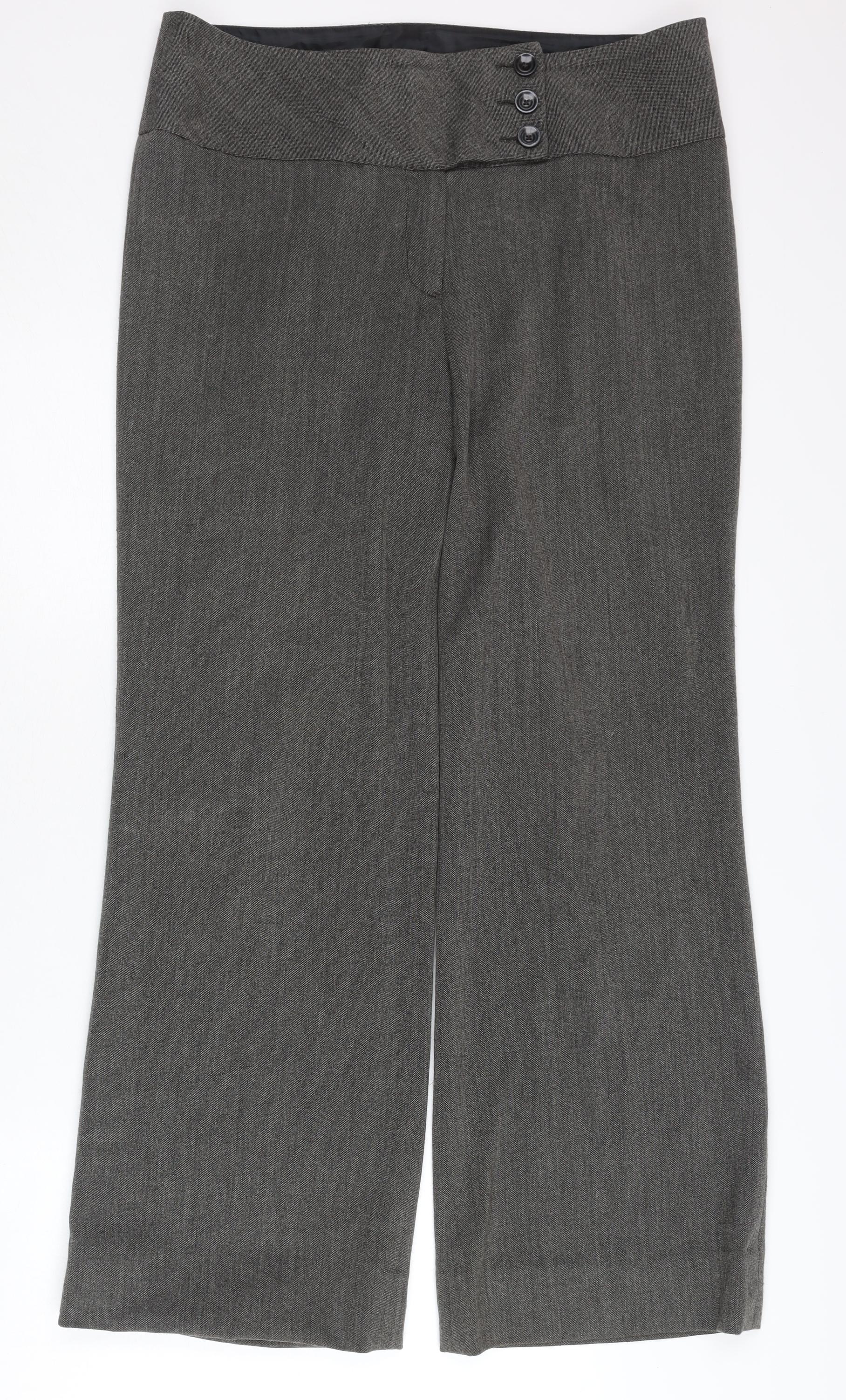 Upgrade your wardrobe with these stylish Debenhams women's trousers. Perfect for versatile wear, these grey trousers are designed in a classic regular fit, suitable for any occasion. Crafted from a quality blend of 65% polyester, 31% viscose, and 4% elastane, they promise comfort alongside durability. These trousers feature a flat front and a convenient button closure, making them ideal for both business and casual settings. Their no-pattern design ensures a timeless addition to any ensemble. Ideal for everyday wear, these Debenhams trousers are machine washable for effortless garment care. With a size type of regular, they fit comfortably on a size 12, offering ease of movement and style in one package. In excellent condition, these trousers come at a great price, allowing you to look your best with a refined, polished appearance.