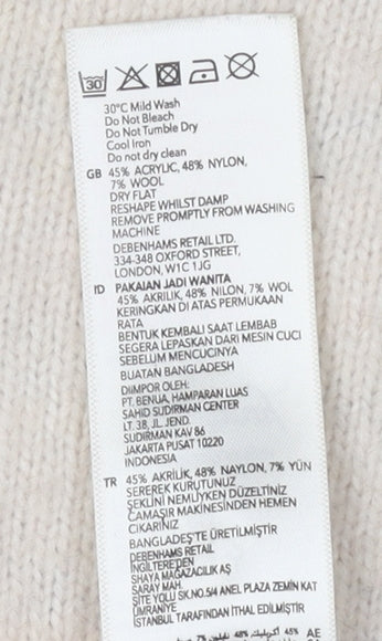 This Debenhams women's jumper in size 12 offers a chic and casual style perfect for the colder months. Crafted from a blend of acrylic, nylon, and wool, this knit pullover combines comfort and durability. Its delightful multicoloured design, with striking navy and beige tones accented by a vibrant red, adds a touch of vibrancy to your wardrobe. The jumper features a classic crew neck and long sleeves, making it an ideal choice for laid-back autumn and winter days. Its regular fit ensures a flattering silhouette for all occasions, while the striped pattern on the back introduces a playful contrast. Accents like neat button detailing further enhance its appeal. Whether you're dressing for a relaxed day out or just enjoying a cosy evening indoors, this jumper's snug construction ensures you stay warm and stylish. Machine washable for easy care, this piece demonstrates both practicality and fashion. With minimal wear and completely intact buttons, it's in excellent condition, ready to revamp your seasonal wardrobe.