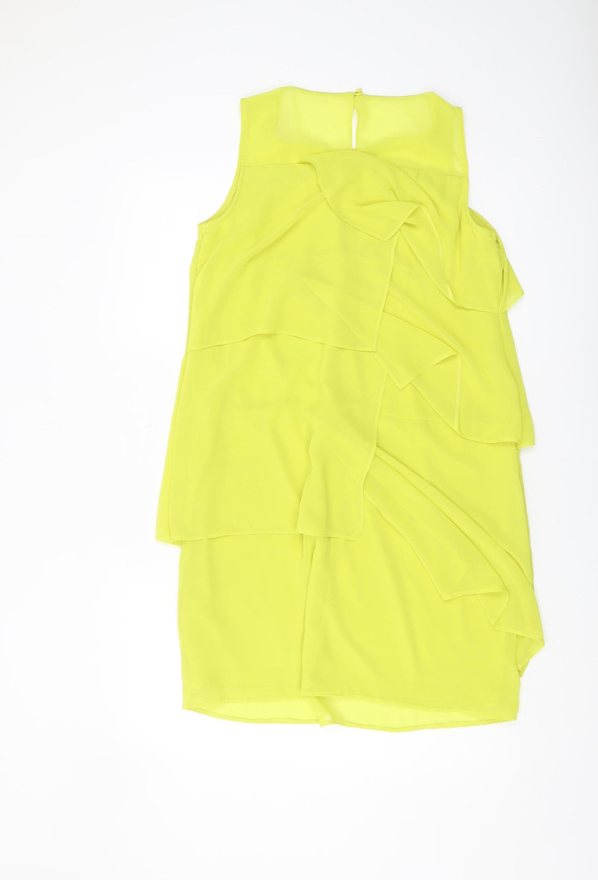 Step into the spotlight with this vibrant yellow Sheath dress from Debenhams. Perfect for summer parties and cocktail evenings, this dress is designed to make you stand out. Crafted from lightweight chiffon, it offers a comfortable fit with its layered accents for added flair. The sleeveless design and round neckline provide an elegant touch, making it ideal for warm weather occasions. Measuring in a petite size 12, it's tailored to flatter smaller frames. Its short length enhances its playful and modern vibe. Made of 100% polyester, it’s not only stylish but also easy to care for, as it is machine washable for your convenience. The dress features a secure zip closure at the back, ensuring a perfect fit. Wear this dress to dazzle at any summer event, from weddings to garden parties. Whether teamed with subtle accessories for a chic day look or statement jewellery for an evening out, this dress is sure to become a staple in your wardrobe. Its excellent condition ensures versatility and a long-lasting wear, providing you with numerous fashion opportunities. Get ready to enjoy effortless elegance and turn heads wherever you go with this must-have summer essential from Debenhams.