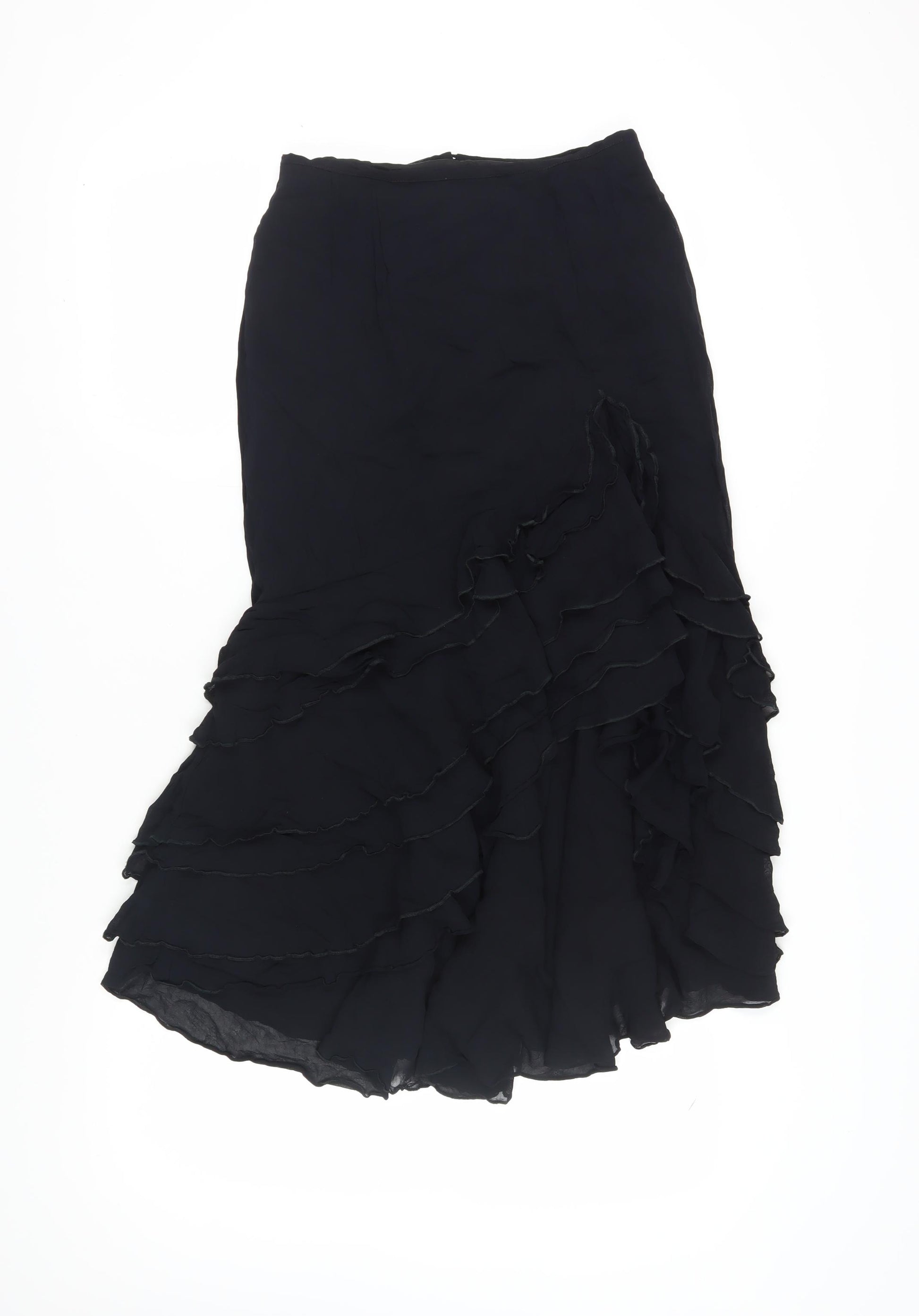 This elegant Début women's skirt in size 12 offers a sophisticated addition to your wardrobe. Featuring a classic black hue, its trumpet style adds a touch of flair to the midi length silhouette. Ideal for formal occasions, the skirt is crafted from luxurious viscose with a chiffon fabric type, ensuring both comfort and style. The ruffle accents add elegance to the design, making it a chic choice for any dressy event. Tailored with a convenient zip closure and lined for a smooth finish, this skirt is versatile for all seasons. Whether attending a wedding or a dinner party, this stylish midi skirt will keep you looking refined and poised.