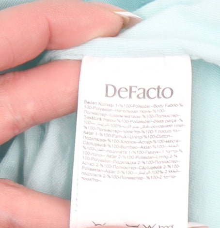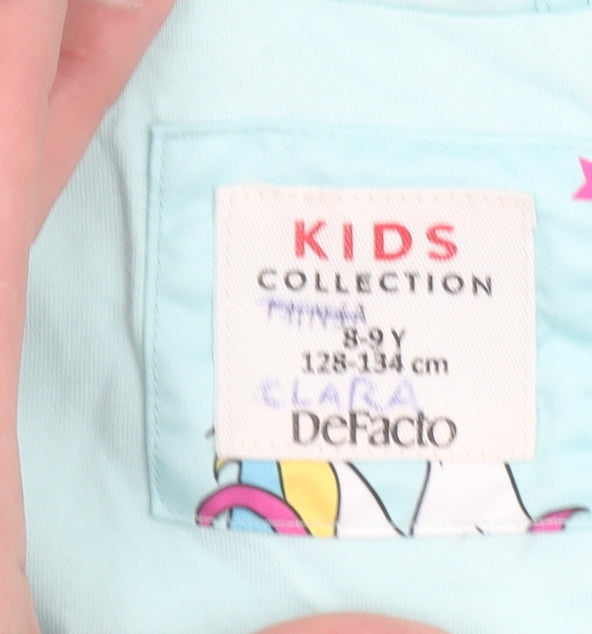 Brighten up rainy days with this adorable DeFacto Girls Blue Unicorn Hooded Rain Coat, perfectly designed for fun-loving youngsters who want to stay dry and stylish. Crafted from 100% polyester, the lightweight woven outer shell provides durable water resistance, while the soft polyester lining ensures comfort during unpredictable spring and summer weather. The jacket’s sky blue base is decorated with a charming rainbow-maned unicorn and stars print pattern – a playful design guaranteed to delight any unicorn fan. This mid-length coat includes a practical full zip closure for easy fastening, a secure hood for added protection against the elements, and two front pockets to keep little hands warm or store small treasures. Featuring a regular fit and long sleeves with elasticated cuffs, it delivers freedom of movement while maintaining a snug yet comfortable feel. Suitable for school runs, outdoor play, and everyday adventures, this versatile piece blends practicality with cheerful personality. In very good used condition, it shows minimal wear with no stains or damage, although a name has been written inside, reflecting gentle previous use. The perfect choice to keep your child dry, happy, and fashionable in all seasons, especially during those light spring and autumn showers. Machine washable for quick and easy care, this DeFacto unicorn coat offers both charm and convenience without compromising quality.