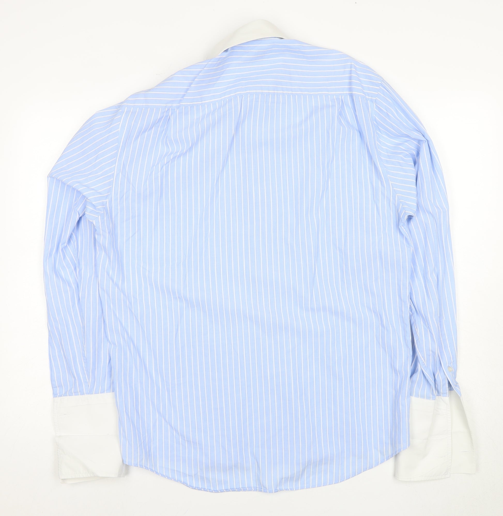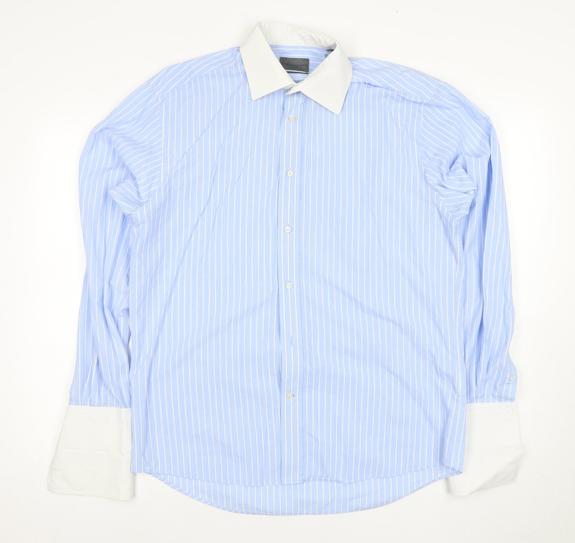 Elevate your wardrobe with this classic Dehavilland men's dress shirt, expertly tailored for business, formal, or casual occasions. The shirt features a sophisticated light blue stripe pattern, making it a versatile option for any event. Crafted entirely from high-quality cotton, this piece ensures comfort and breathability throughout the day, whether you're at work or enjoying a casual outing. The shirt boasts long sleeves with elegant French cuffs, perfect for matching with your favourite pair of cufflinks. Its point collared neckline adds an extra touch of timeless style, seamlessly pairing with a tie or worn open for a relaxed look. Designed with a button-down closure, this dress shirt offers a polished appearance while being easy to wear. Its lightweight woven fabric ensures you stay cool and comfortable, no matter the setting. While the shirt is in 'Excellent' condition with only slight creasing from storage, it exhibits quality craftsmanship and charm that will fit right into your collection. Machine washable for your convenience, this shirt requires minimal maintenance, providing you with more time to enjoy wearing it. Available now, this Dehavilland piece delivers both style and comfort, inviting you to outfit your wardrobe confidently.
