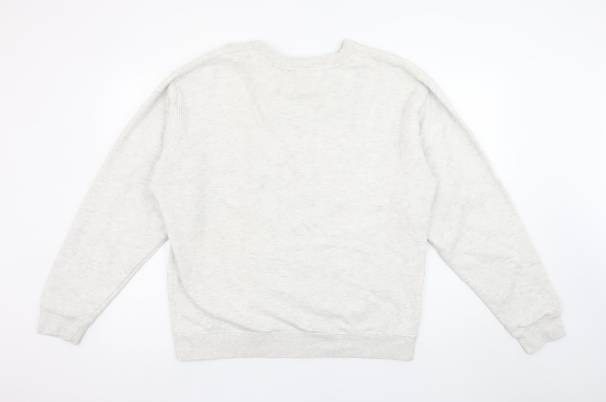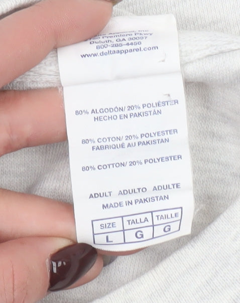 This Delta Fleece Women’s Grey Pullover Sweatshirt size L combines everyday comfort with a touch of artistic charm. Crafted from a soft cotton-polyester blend, it offers a cosy feel with excellent breathability. The lightweight fleece fabric ensures warmth without bulk, making it an ideal choice for seasonal layering. Featuring a beautiful pastel geometric wolf graphic framed by stylised trees, this sweatshirt adds a refined yet playful aesthetic to casual attire. The soft heather grey colour pairs easily with jeans, leggings, or joggers, offering versatility for both relaxed outings and lounging at home. Designed with a crew neckline, long sleeves, and ribbed hem and cuffs, it provides a relaxed and comfortable fit suitable for all body types. The durable 80% cotton and 20% polyester construction ensures long-lasting softness and shape retention after washing. This piece represents effortless style with its subtle nod to nature and clean finish. Perfect for cooler days in autumn, brisk spring mornings, or layering in winter, this sweatshirt's neutral tone complements a range of wardrobe colours. Whether styling it for a walk, coffee date, or casual weekend wear, it brings both comfort and charm. Ideal for women who appreciate quality materials and graphic detailing that expresses individuality, this pullover is both stylish and practical. With no visible flaws and in excellent pre-owned condition, it’s a dependable wardrobe favourite at a great value. Refresh your casual essentials with this relaxed-fit Delta Fleece sweatshirt and enjoy an easy blend of warmth, softness, and modern minimalism.