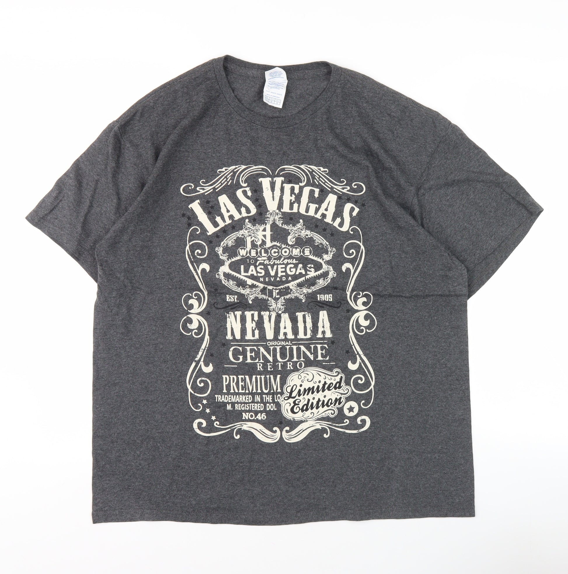 Embrace the spirit of Las Vegas with this Delta Pro Weight Men's Grey Retro Graphic T-Shirt. Crafted for comfort, this shirt features a blend of 50% cotton and 50% polyester, ensuring a soft feel and durability. The graphic print showcasing Las Vegas gives it a unique, vintage vibe, perfect for casual outings or adding a statement piece to your ensemble. With a classic crew neckline and short sleeves, it offers a timeless silhouette suited for all seasons. This T-shirt is limited edition and preshrunk, maintaining its size and fit after washes. Machine washable for ease of care, it is an excellent choice for any fashion-forward individual. Whether you're heading out for a casual day or looking to make a style statement, this grey T-shirt embraces versatility and charm. Add a touch of Las Vegas flair to your wardrobe today.