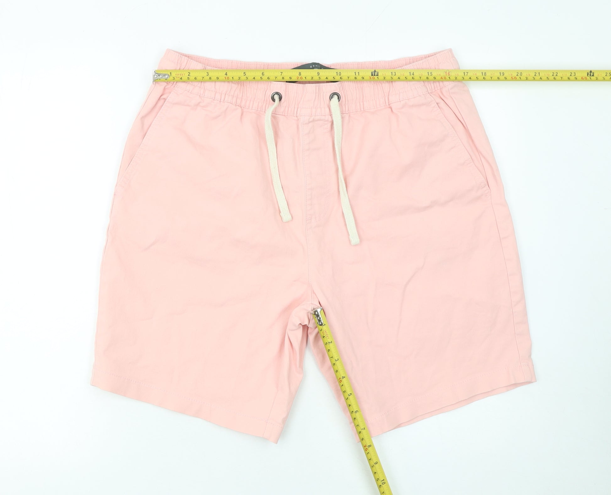 Step into effortless summer style with these Denim Co. Men’s Pink Bermuda Shorts in size L. Designed for comfort and a relaxed look, these shorts combine functionality with timeless charm. Crafted from a soft and breathable cotton blend with a touch of elastane, they offer flexibility and freedom of movement, making them perfect for warm days and casual outings.The shorts feature a smooth, lightweight canvas fabric in a subtle pink hue, offering a stylish alternative to standard neutral tones. An elasticated waistband with an adjustable drawstring provides a secure and personalised fit, while the flat front and clean design create a contemporary silhouette. With side slash pockets and two back welt pockets, these shorts deliver on both practicality and style.Ideal for everyday wear, holidays, travel, or relaxing weekends, these Bermuda-style shorts are versatile enough to pair with t-shirts, polos, or casual shirts for an easy-going yet sharp summer look. The mid-rise cut ensures comfort, while the cotton-rich composition helps to keep you cool throughout the day.Machine washable and easy to care for, these shorts are made for men who value both fashion and convenience. The minimal detailing gives them a modern aesthetic, making them suitable for casual or smart-casual occasions alike. Whether you’re heading to the beach, going for a stroll, or enjoying a laid-back gathering, these pink shorts provide a stylish finishing touch to any outfit.With a flawless combination of comfort, quality, and colour, these Denim Co. Bermuda Relax shorts are the perfect addition to any wardrobe. Conditioned in excellent pre-owned shape, they show minimal signs of wear, guaranteeing plenty of life left in this classic piece of summer attire.