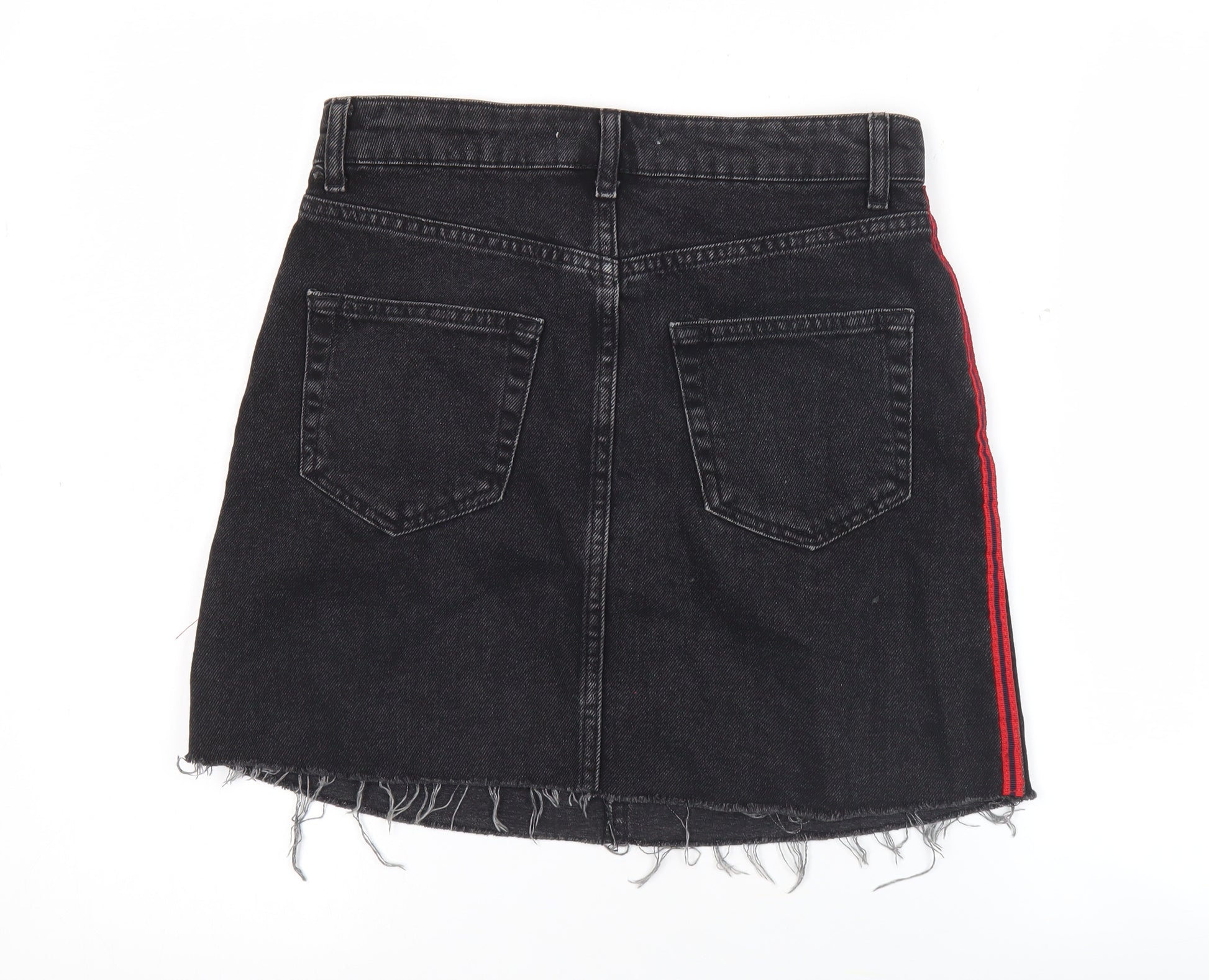 This stylish Denim Co women’s black denim mini skirt in a flattering A-line cut is a versatile piece that adds an effortlessly cool edge to any wardrobe. Crafted from 100% durable cotton, the skirt features a mid-rise waistline with classic button and zip fastening, providing a secure and comfortable fit that flatters the figure. Its lightweight denim construction makes it perfect for warmer months, while still being versatile enough for year-round styling when layered with tights or boots.The skirt is cut in a short length with a raw, frayed hemline that gives it a modern, edgy finish. It includes practical front and back pockets, ideal for small essentials, while a red stripe detail along the side seam adds a striking pop of colour and sporty contrast to its overall design. This subtle accent enhances the skirt’s casual appeal, making it great for everyday wear, festivals, or relaxed weekends.Finished in solid black, this skirt is easy to pair with a wide variety of tops and shoes. Style it with a tucked-in blouse and heeled boots for a chic casual outfit, or keep it relaxed with trainers and a tee. Made in Turkey, this Denim Co skirt embodies quality craftsmanship with a laid-back, contemporary look.In very good pre-loved condition, it shows light signs of wear consistent with previous use, adding to its vintage-inspired denim charm. The raw hem and side stripe design ensure it remains a trendy choice for someone looking to update their everyday wardrobe. Whether styled for casual outings, layering in transitional seasons, or creating festival-ready outfits, this skirt will become a go-to piece. Affordable, stylish, and easy to wear, it’s a fantastic addition to a fashion-forward wardrobe.