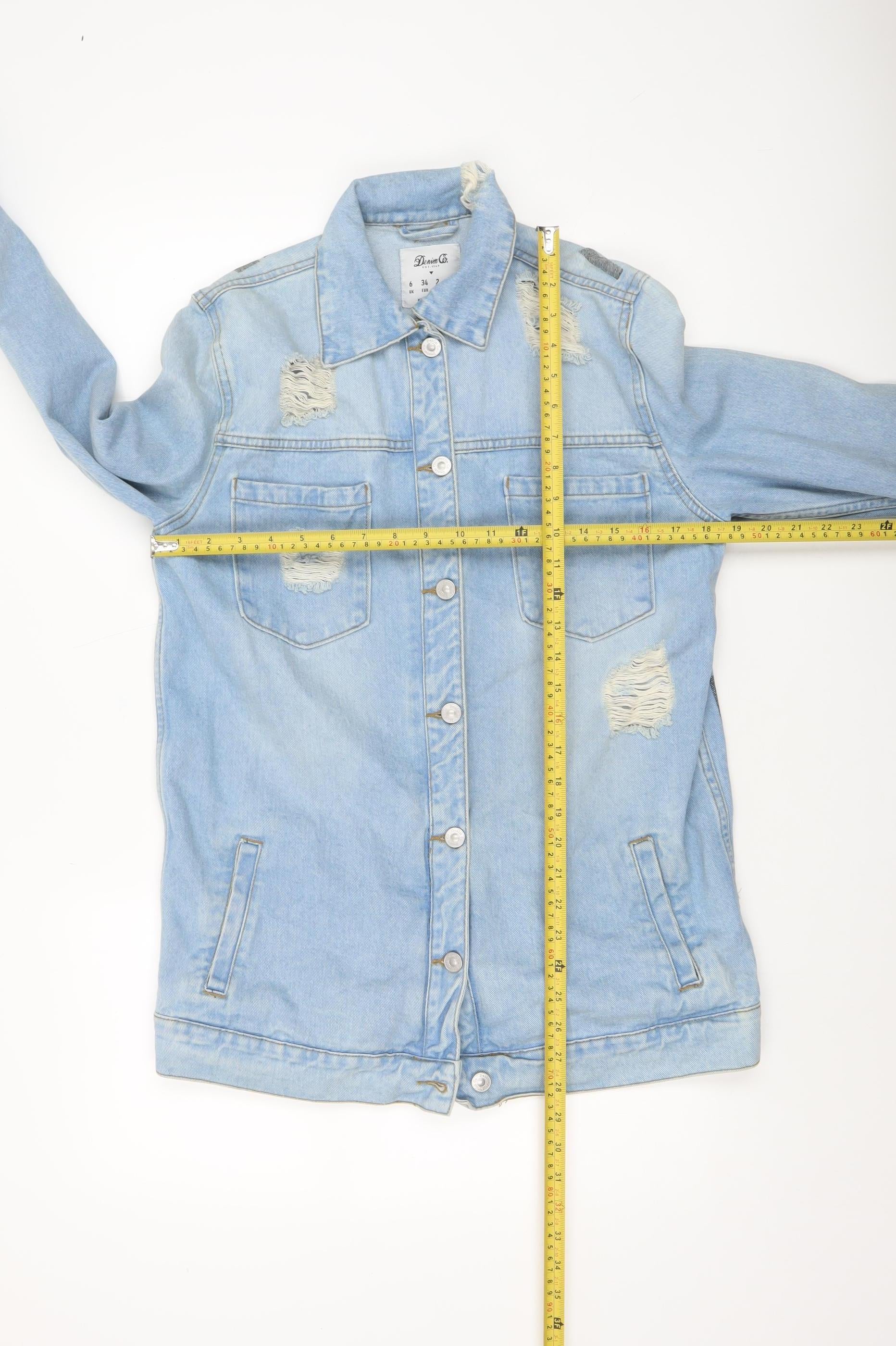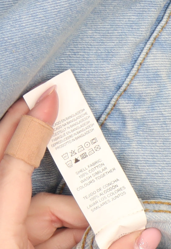 This Denim Co. women’s light blue denim jacket is a stylish and versatile addition to your wardrobe. Crafted from 100% cotton, it offers a comfortable fit and breathable wear, making it ideal for layering through the spring and autumn seasons. The jacket features a relaxed, regular fit with a mid-length cut, offering both classic styling and modern appeal. Its collared neckline and button-down front give it a timeless silhouette reminiscent of classic denim outerwear, while the distressed details at the front and back add a trendy, lived-in aesthetic. Two front patch pockets and two angled side pockets enhance practicality and everyday wearability, perfect for both casual days out and laid-back evenings. The back of the jacket includes bold text detailing, giving it a unique and statement-making edge. Finished with button cuffs and a slightly curved hem, the design flatters and offers a comfortable, easy-to-style fit. This jacket pairs effortlessly with jeans, skirts, or dresses, bringing an effortless cool-girl vibe to any outfit. Ideal for layering over tees or sweaters, it transitions seamlessly between seasons. Its durable denim fabric ensures longevity, while the subtle fading across seams adds depth and character. The lightweight feel makes it suitable for everyday wear and travel alike. Conditioned in very good pre-owned condition with only minor signs of wear, this jacket has been well cared for and maintains its excellent shape and colour. Perfect for those who appreciate classic wardrobe staples with a touch of attitude, this Denim Co. jacket provides comfort, style, and versatility, making it a must-have piece for casual, on-trend styling.