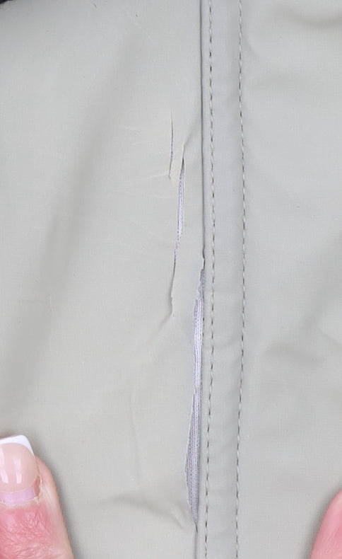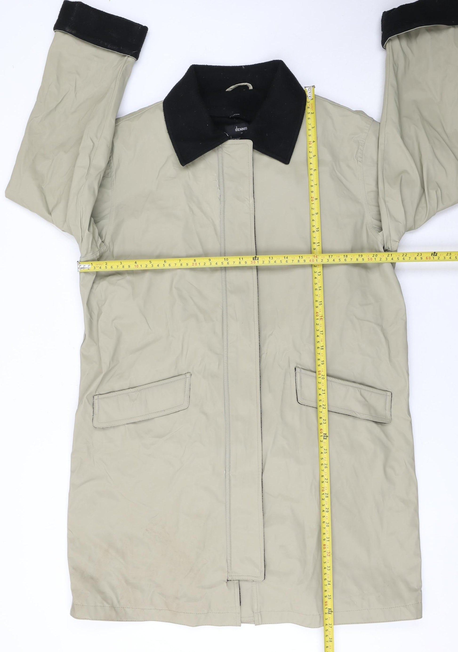 This Dennis Basso men's beige rain coat combines practical design with a touch of refined style. Crafted from a durable outer shell comprising polyvinyl chloride with a polyester backing, it offers dependable protection against light rain and wind while maintaining a sleek and polished finish. The coat features a mid-length cut, providing excellent coverage and comfort for cooler seasons such as autumn and winter. A removable black collar and inner lining, both finished in soft polyester, allow for versatile wear and easy cleaning. The spread collar adds a sophisticated edge, while the zip and snap closure ensures a secure and streamlined fit. Two front flap pockets provide convenient storage options for daily essentials. Designed for casual and travel use, this jacket suits the needs of modern men seeking reliable outerwear with timeless appeal. Though showing minor signs of wear, including a small tear near the pocket, the coat remains in good condition and fully functional. Ideal for city walks, commuting, or outdoor leisure activities, this water-resistant coat balances elegance with practicality. With Dennis Basso’s quality craftsmanship, this wardrobe essential offers enduring performance and understated charm for those who value both comfort and class.