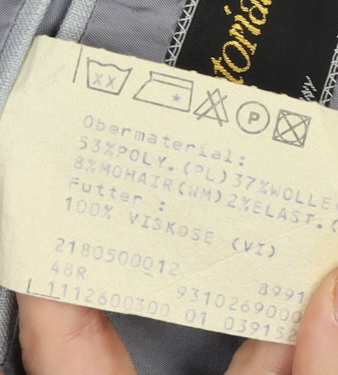 Elevate your formal attire with this elegant grey blazer from DESCH, perfect for business and formal occasions. Crafted in a size 48R, this single-breasted jacket features a sophisticated notch lapel and a timeless two-button front style. Designed for comfort and style, it offers a sleek and polished look that is ideal for autumn and winter seasons.Made from a premium blend of materials, including 53% polyester, 37% wool, 8% mohair, and 2% elastane, this blazer ensures a comfortable fit and a refined appearance. The interior is lined with 100% viscose, adding a touch of luxury to the garment. Notably, the jacket is meticulously detailed with a double-vented back, inner pockets, and a three-button sleeve style, offering practicality and a tailored finish.Though previously worn, the blazer remains in very good condition with minor stains visible on the fabric, yet they do not detract from its overall charm. This classic piece is versatile, allowing for easy pairing with a variety of trousers and shirts—perfect for making a lasting impression in any boardroom or formal setting. With careful attention to garment care, this piece is recommended for dry clean only, ensuring longevity and maintenance of quality.Upgrade your wardrobe with this sought-after DESCH blazer, a stylish choice for those seeking a refined touch to their sartorial collection.