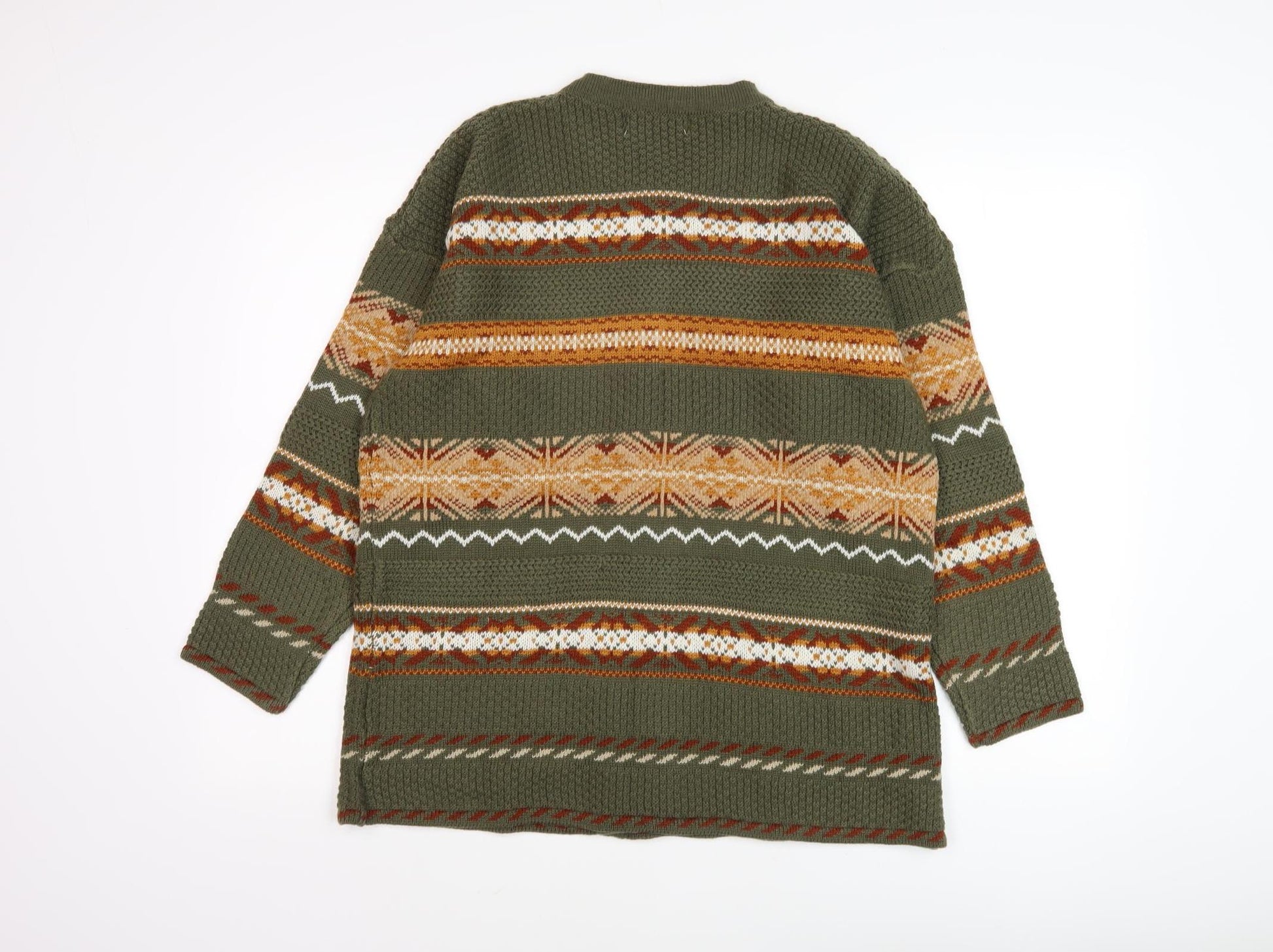 Step into warmth and style with this delightful green cardigan by Design Essentials. Crafted to perfection for women who appreciate classic yet chic fashion, this medium-sized cardigan boasts a tight-knit design infused with a rich Fair Isle pattern. Featuring a comfortable crew neck and long raglan sleeves, it's perfect for embracing the crisp seasons of autumn and winter. Made from 100% Acrylic, it promises not just warmth but pristine comfort. Its inviting green hue adds a touch of nature to your wardrobe, making it an ideal pick for casual occasions. The relaxed fit ensures you carry a laid-back vibe, whether you're lounging at home or headed for a casual outing. What makes this piece even more appealing is its button accents that lend an understated charm. Easily machine washable, it's designed for hassle-free maintenance. Although it shows light wear, its quality remains intact, making it an excellent find for lovers of retro themes. Elevate your wardrobe with this classic cardigan and embrace fashion that seamlessly blends comfort and charm.