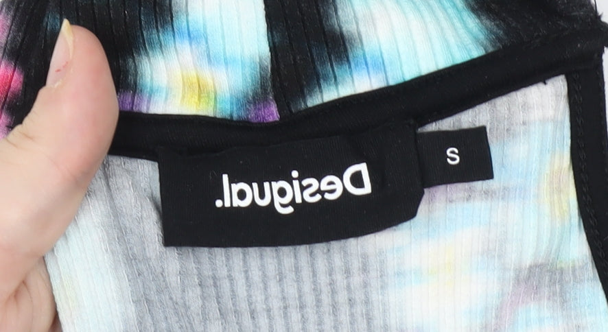 Step out in style with this eye-catching Desigual bodycon dress, perfect for casual outings and cocktail parties. This vibrant multicoloured dress features a striking floral pattern that exudes bohemian flair. Designed for women, it offers a flattering fit with its sleeveless cut and high neckline, making it an ideal choice for spring and summer occasions. The dress is crafted from soft knit fabric composed of 95% viscose and 5% elastane, providing a comfortable, stretchy fit that moves with you. Convenience is key with its easy pullover style, and its regular size S ensures a fit that's true to size. This dress's playful strappy sleeves add a trendy touch, while the absence of visible signs of wear maintains an excellent condition for a wardrobe staple you'll love. Pair it with your favourite heels for a night out or keep it casual with flats for daytime adventures. Embrace effortless style with this unique piece from the iconic brand Desigual.