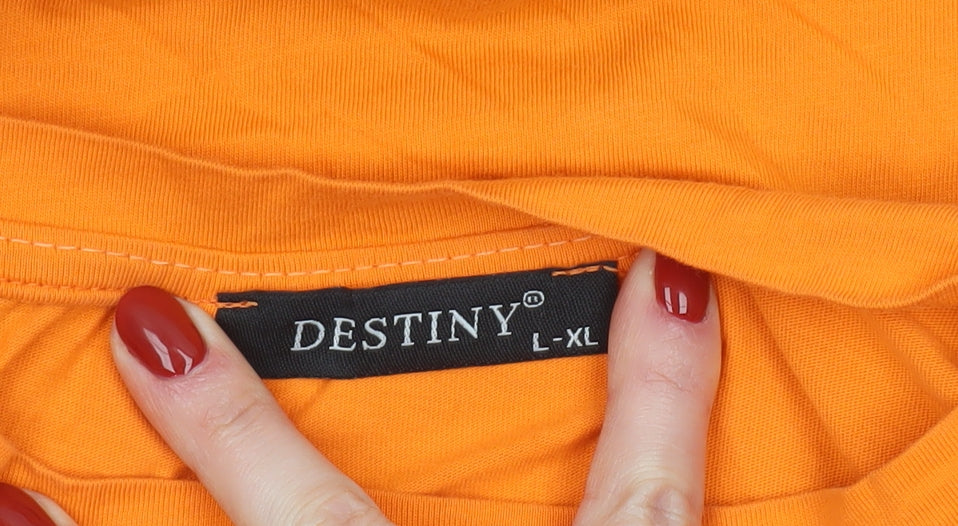 Add a burst of fun and character to your casual wardrobe with this vibrant men's orange T-shirt from Destiny. Featuring the iconic Rick and Morty cartoon graphics printed boldly across the chest, this shirt captures the quirky spirit of the hit animated series. Designed in a comfortable regular fit, it offers a laid-back, easy-to-wear look that’s perfect for any casual outing or relaxed day at home. Crafted from 100% cotton jersey fabric, this T-shirt is both soft and breathable, making it ideal for warm weather. The round crew neckline and short sleeves give it a classic silhouette, while the bright orange colour ensures you stand out wherever you go. The lightweight material adds to the comfort, making it perfect for spring and summer wear. This Destiny T-shirt embodies a fun, youthful vibe that any Rick and Morty fan will love. The bold graphic print remains the real focal point, showcasing Rick and Morty’s unmistakable faces with a humorous twist surrounded by inspired lettering. In very good pre-owned condition, this T-shirt shows only minor signs of wear, such as light wrinkling, yet retains strong colour vibrancy and print quality. Easy to care for, it’s machine washable and made to last through countless wears. Pair it with jeans or shorts for an effortlessly cool and geeky look at conventions, casual hangouts, or lazy weekends. Whether you’re adding to your Rick and Morty collection or simply want a comfortable and eye-catching shirt, this versatile piece will not disappoint. Fun, breathable, and stylish, it’s the perfect way to showcase your personality with comfort and confidence.