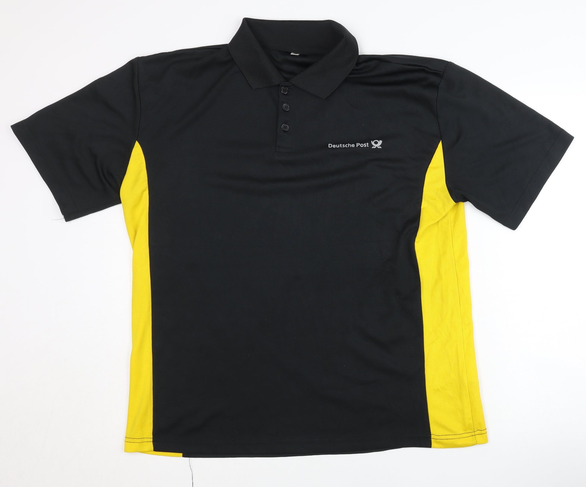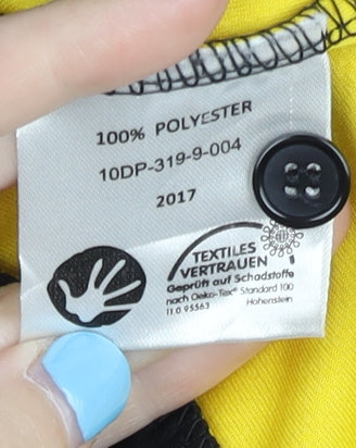This Men's Black and Yellow Polo Shirt, available in a Size L, stands out with its vibrant colourblock design and durable construction. Ideal for those seeking an eye-catching yet comfortable top, the shirt is tailored for activewear with a focus on practicality. Made from 100% polyester, the fabric offers easy maintenance as it is machine washable, maintaining quality even after multiple wears. The short sleeves and collared neckline add to its classic yet sporty appearance, making it suitable for various casual or active occasions. This polo shirt features a button-down collar style, enhancing its sophisticated look, while the subtle branded logo accents add a touch of exclusivity. Whether you're heading out for a casual day or need a reliable top for a workout, this polo shirt offers the versatility you desire. Excellent condition with minimal wear observed, ensuring you receive a top-notch piece to complement your wardrobe.