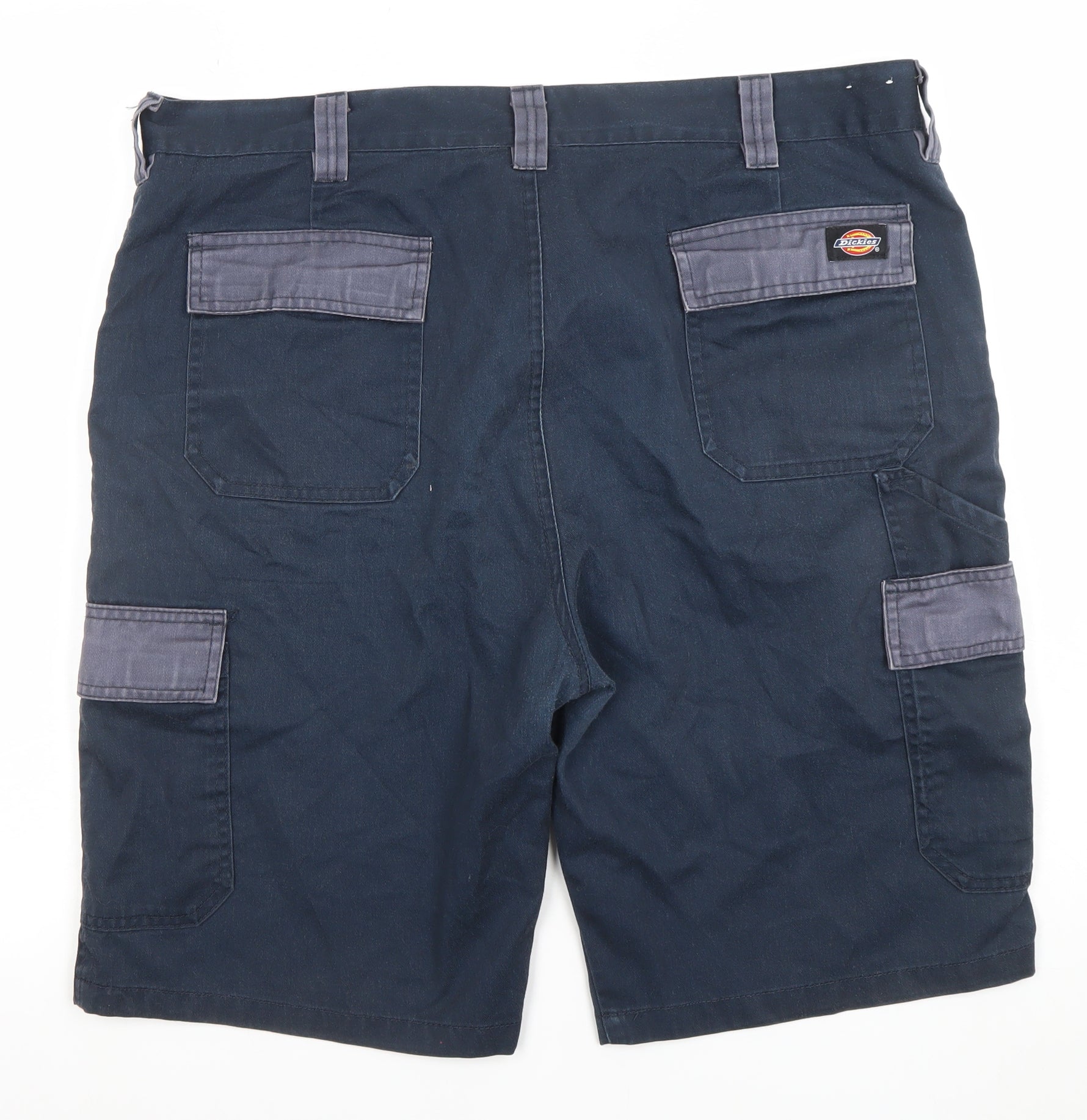 These Dickies Men’s Blue Cargo Shorts are the ideal combination of durability, comfort, and style for everyday wear or tough work environments. Built from a sturdy yet comfortable blend of polyester and cotton canvas, these shorts provide long-lasting performance while ensuring ease of movement throughout the day. The dark blue colour with contrasting grey pocket flaps adds a professional yet casual touch, making them suitable for both workwear and off-duty days.Designed in a classic regular fit with a mid-rise waist, these shorts feature secure button and zip fastening, alongside multiple practical pockets including deep slash front pockets and spacious cargo pockets for convenient storage. The reinforced stitching and easy-care fabric ensure these shorts withstand repeated wear and washing without losing their shape. Whether you’re at work, tackling DIY projects, or enjoying the outdoors, these cargo shorts deliver practical functionality and everyday resilience.The breathable material makes them perfect for warmer months, while their tough construction maintains comfort and shape even with heavy use. The Dickies logo patch stands proudly as a mark of quality and reliability that the brand is renowned for among tradespeople and outdoor enthusiasts alike.Styled to suit men looking for reliable workwear with casual versatility, these cargo shorts can easily pair with t-shirts, polos, or work tops, offering a go-to option for spring, summer, and early autumn wear. Their slightly wrinkle-resistant fabric keeps them looking neat even during active days, and their functional design supports both style and performance.These shorts are in very good pre-owned condition, showing only light signs of wear with no visible flaws, tears, or stains. They remain structurally sound and ready for continued use. A dependable addition to any wardrobe where practicality meets rugged Dickies heritage. At £18.75, they offer outstanding value for an enduring workwear essential.