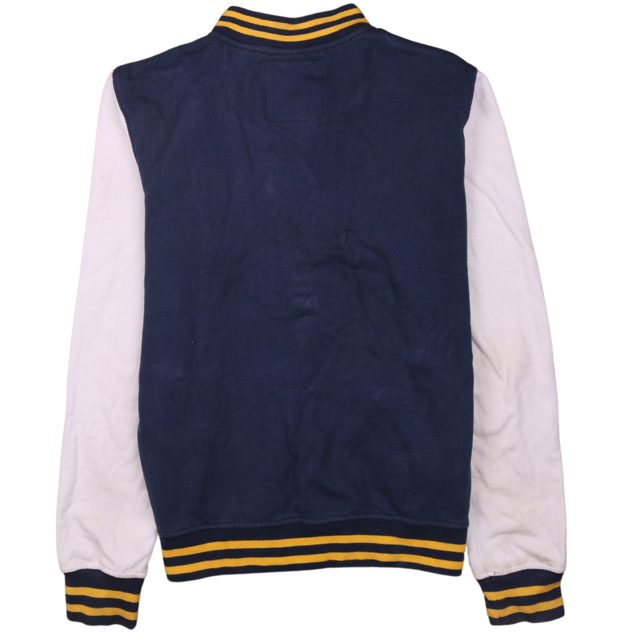 This classic Dickies men's varsity jacket delivers timeless collegiate charm combined with everyday practicality. Designed in a bold navy blue with contrasting white sleeves and yellow stripe detailing on the collar, cuffs, and hem, this jacket embodies sporty American style. Crafted from 100% cotton, the piece provides a soft and breathable feel ideal for cooler days or layering. Featuring a traditional snap-button closure, ribbed trims for added comfort, and front welt pockets, it’s a versatile choice for casual wear. The large “D” chenille patch on the front enhances its vintage varsity appeal, perfect for pairing with jeans, joggers, or chinos. The regular fit ensures ease of movement, offering both comfort and confidence for day-to-day activities. Ideal for transitional seasons such as autumn and spring, this Dickies jacket is lined for warmth yet light enough for relaxed strolls or casual outings. The durable construction showcases the brand’s renowned quality, making it a long-lasting wardrobe staple. Though pre-owned, it’s in very good condition with only minor signs of wear that do not detract from its overall appearance. Machine washable and easy to care for, it’s sure to become a reliable go-to layer for versatile styling. Whether worn for walking, casual meetups, or off-duty weekends, this Dickies varsity jacket provides the perfect blend of comfort, durability, and classic fashion. A must-have addition for anyone seeking a laid-back but stylish streetwear essential that encapsulates both function and heritage design in one smart piece.