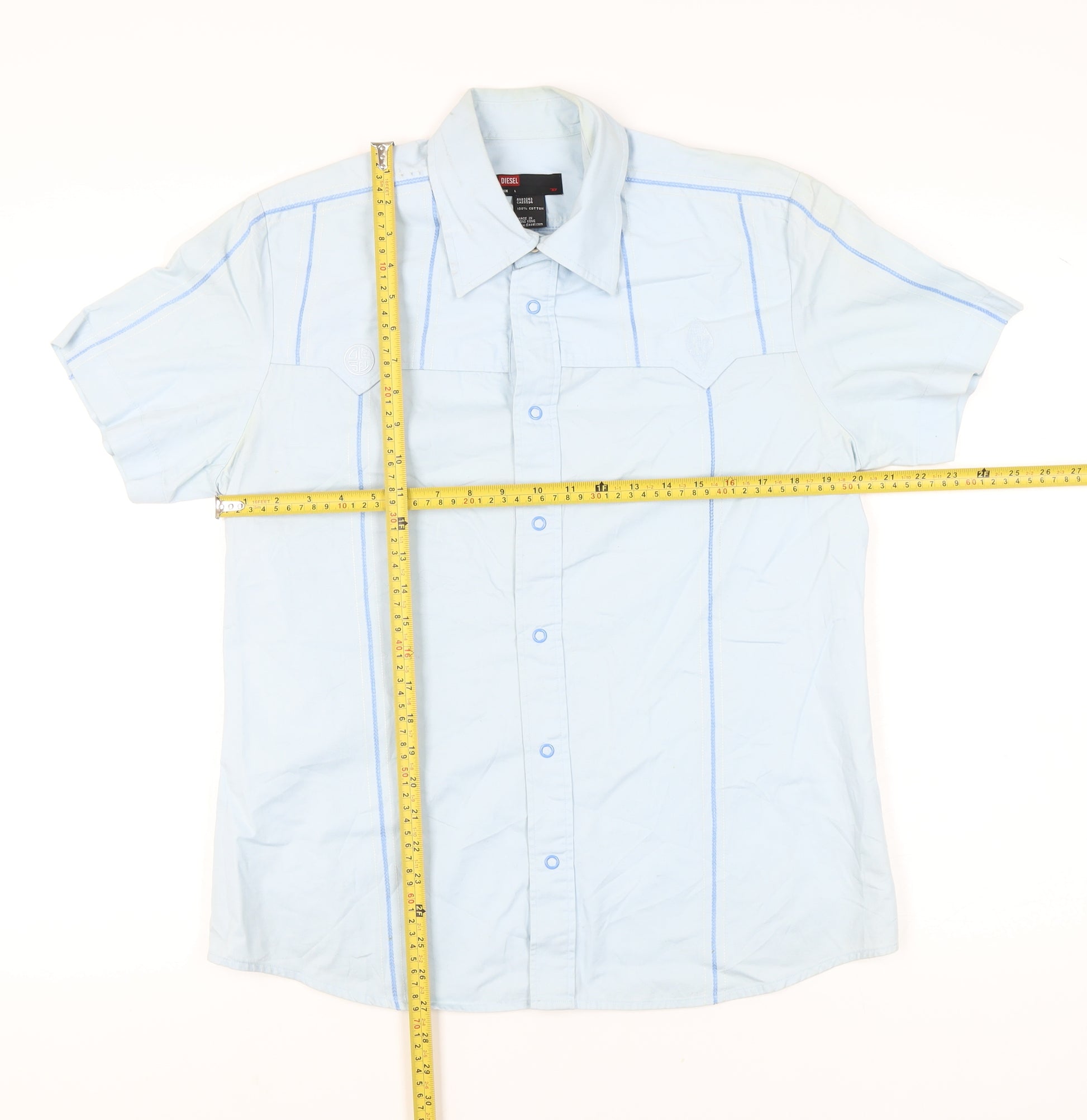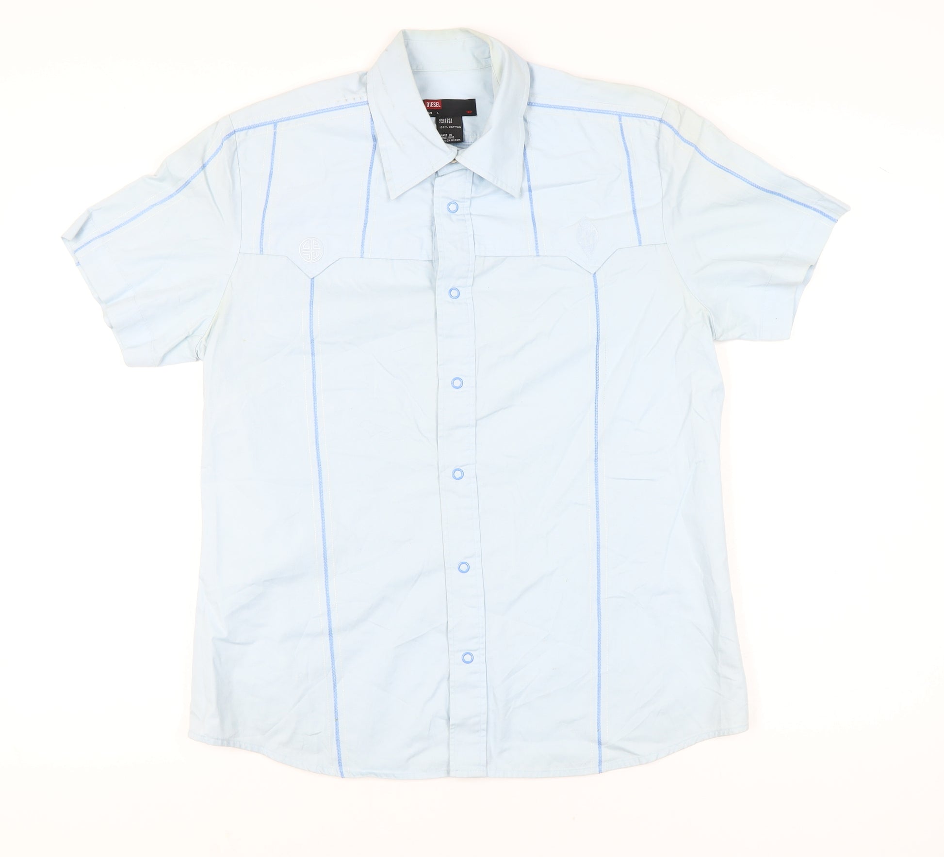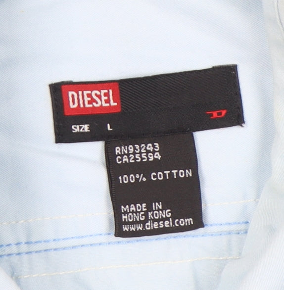 Step up your casual wardrobe with this stylish Diesel men’s short sleeve button-up shirt, crafted from 100% premium cotton for a comfortable and breathable fit. Designed in a versatile light blue shade, this piece offers a classic yet contemporary look that is perfect for everyday wear. The shirt features a collared neckline with a smart point collar style, button closure down the front, and subtle seam accents that add a refined touch to this solid design. Made to a regular fit, this shirt ensures comfort while giving you a laid-back but polished silhouette.Constructed with lightweight woven cotton, this versatile shirt is ideal to wear during warmer months such as spring and summer but works equally well layered beneath a jacket in autumn. Its breathable fabric ensures comfort, making it a great option for casual outings, relaxed work environments, holidays, or a weekend out. Finished with short sleeves and tonal buttons, it maintains simplicity while delivering reliability and comfort.This Diesel shirt is in very good condition, showing minimal wear from previous use with only light creasing present, making it an excellent addition to your wardrobe at a great price. The chest size measures approximately 42 inches, aligning well with a size large in men’s UK sizing, giving you room for ease of movement without compromising its modern, sharp look.Pair it effortlessly with jeans or chinos for everyday use, or wear under a lightweight jacket for a smart-casual vibe. Diesel is known for blending contemporary style with high-quality craftsmanship, and this piece is no exception. With durable stitching, breathable fibres, and its timeless solid blue colour, this shirt offers both aesthetic appeal and practical wearability.Perfect for the man who values comfort without losing style, this Diesel short sleeve blue cotton shirt will become a trusted favourite in your casual collection. A versatile wardrobe essential that balances modern design and everyday practicality.
