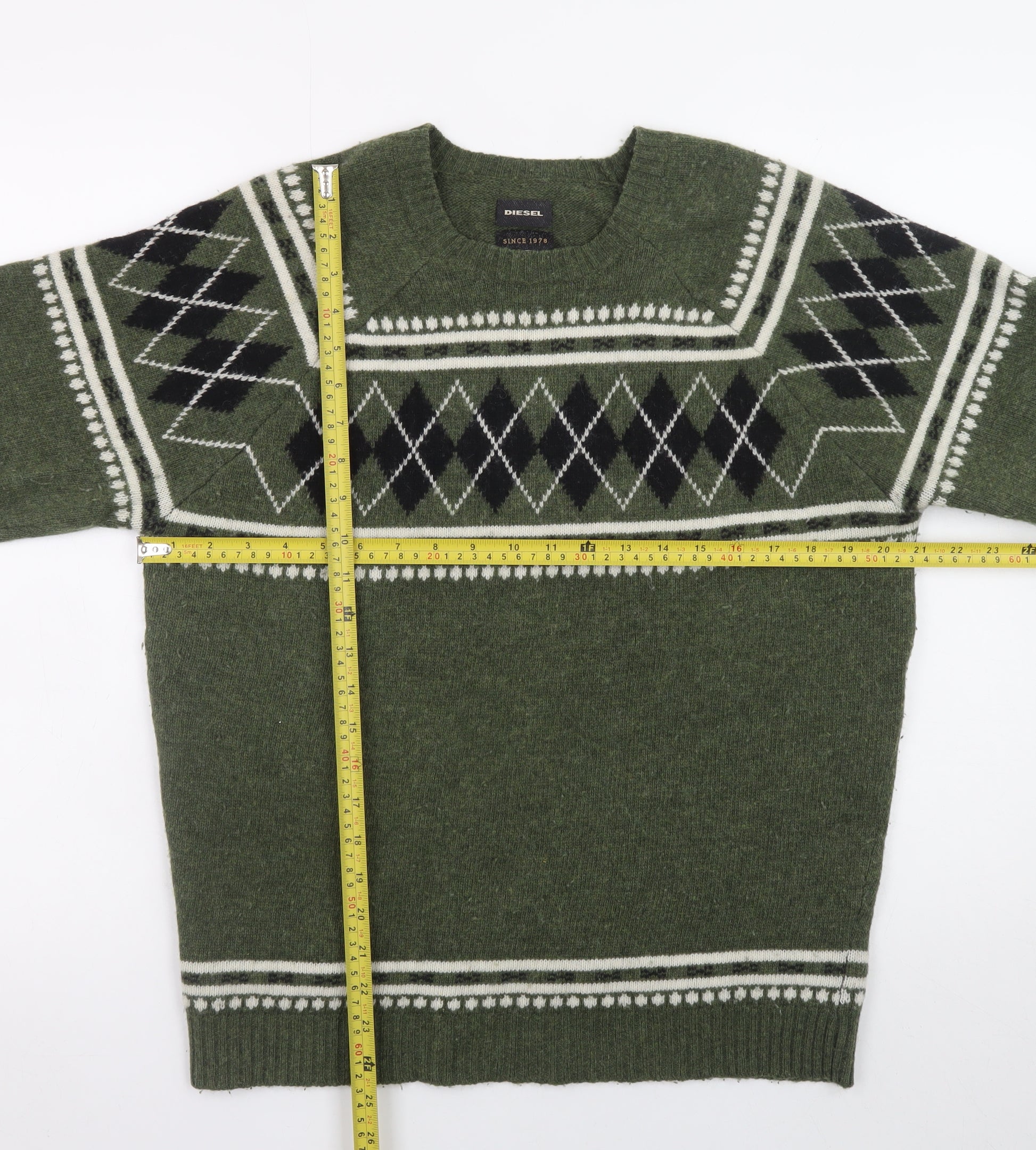 Step up your casual style with this classic Diesel Men's Green Argyle Wool Pullover Jumper in size M. Expertly crafted from 100% wool, this jumper provides superior warmth and comfort, making it perfect for the cooler autumn and winter seasons. The soft wool construction ensures both durability and a premium feel against the skin, while the tight-knit texture maintains its shape wear after wear. The striking green base is complemented by a distinctive argyle diamond pattern in black and white across the chest and shoulders, offering a timeless and sophisticated design with a touch of retro charm.Designed with a regular fit and crew neckline, this pullover provides everyday versatility, suitable for casual weekend outings, layering over shirts, or pairing with denim for a smart laid-back look. The long sleeves and ribbed hem and cuffs add to the refined finish, ensuring comfort and a flattering fit. Diesel branding signifies the stylish quality synonymous with the brand’s urban edge, making this jumper a wardrobe must-have for those who appreciate understated luxury and enduring craftsmanship.This jumper is in excellent pre-owned condition with only light signs of wear and no visible damage, ensuring continued enjoyment for seasons to come. Ideal for layering or wearing solo, it’s an easy go-to piece for versatile styling. Whether you’re heading out for a coffee, relaxing indoors, or enjoying a relaxed evening out, this Diesel wool jumper offers effortless comfort and sophistication. A must-have addition to any modern man’s wardrobe, combining warmth, texture, and timeless appeal with Diesel’s signature attention to detail.
