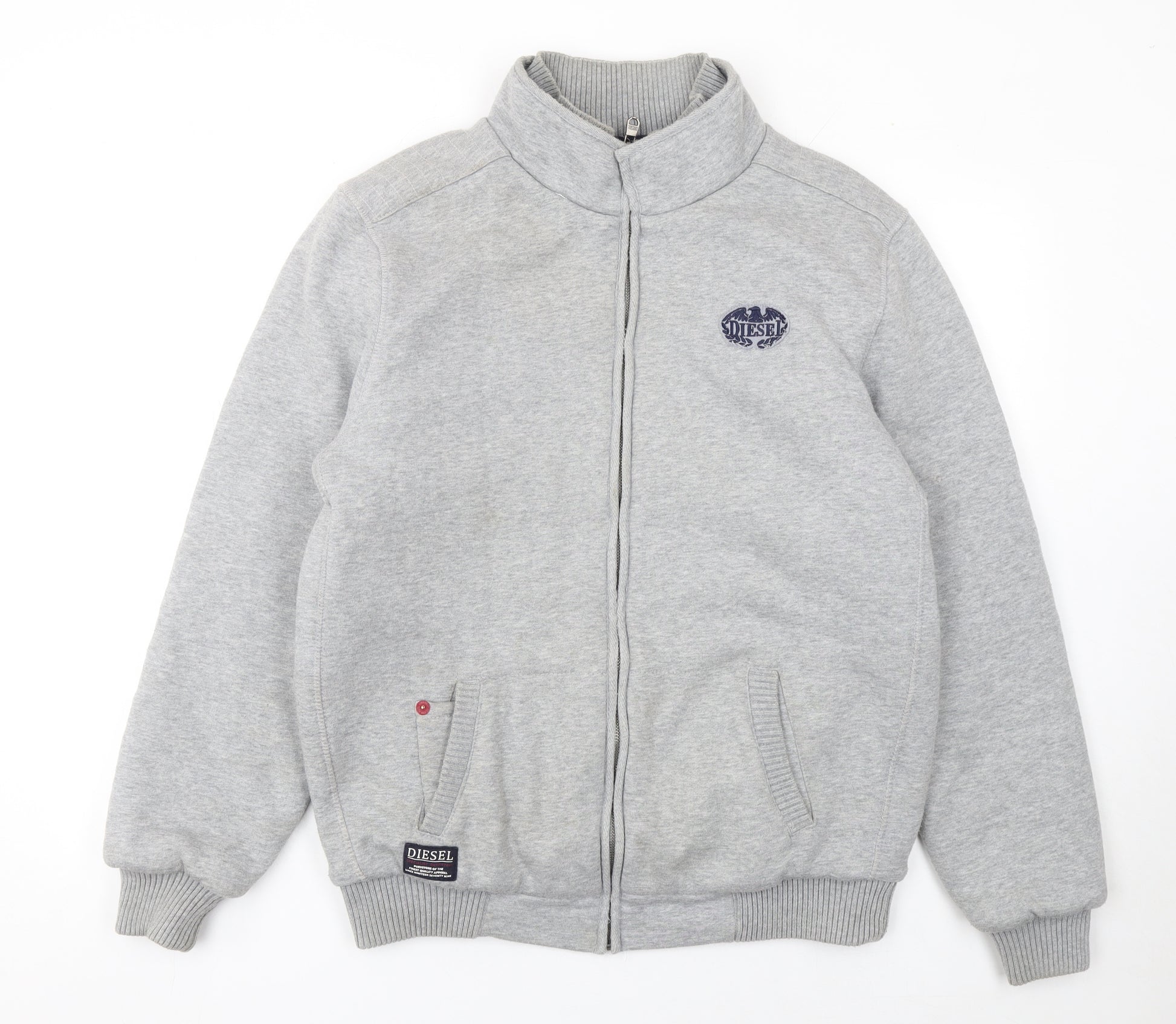 Elevate your casual wardrobe with this Diesel men's grey full zip sweatshirt, perfect for layering during the cooler seasons. Crafted from a soft and durable blend of 70% cotton and 30% polyester, it offers both comfort and resilience for everyday wear. The classic grey colour provides versatility, making it easy to pair with jeans, joggers, or shorts for a relaxed yet stylish look. Designed in a regular fit with a high neckline, this piece ensures warmth and structure while maintaining a modern silhouette. Practical details include two front pockets for convenience, ribbed cuffs and hem for added comfort, and a sturdy zip closure that makes it easy to put on or take off. The distinctive Diesel logo embroidery on the chest and branded patch near the hem lend an authentic designer finish. Perfect for casual outings, weekend wear, or travel, this sweatshirt embodies Diesel’s signature mix of rugged style and laid-back comfort. The heavyweight fabric and full lining keep you warm without sacrificing breathability. Though gently worn, it remains in very good condition with only minor fabric marks that do not detract from its appeal or quality. A dependable choice for autumn and winter, this sweatshirt combines timeless design with the brand’s well-known craftsmanship. Layer it under a jacket for cold days or wear it solo for an effortlessly cool look. Ideal for any man seeking understated style with premium comfort, this Diesel sweatshirt is a reliable wardrobe essential for casual sophistication and everyday performance.