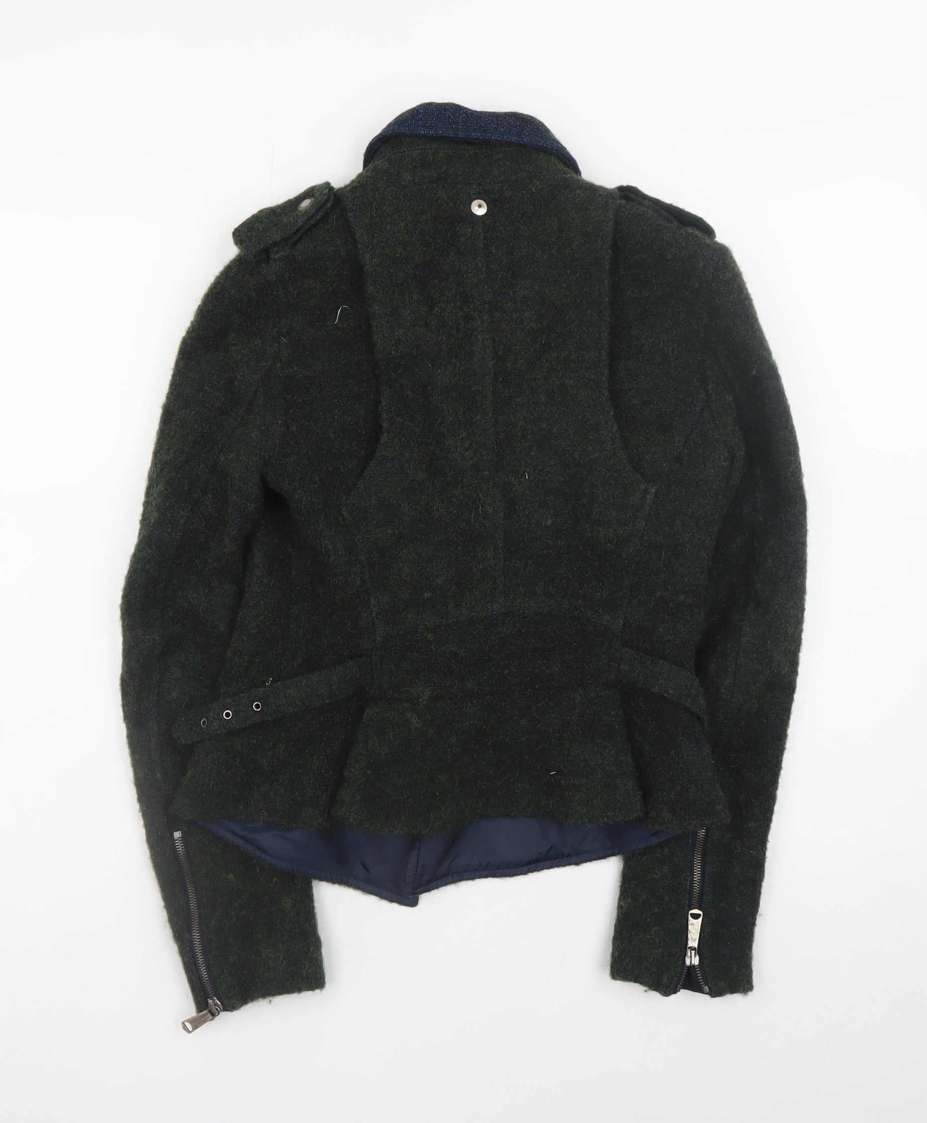 This Diesel Women’s Dark Green Biker Jacket in size XS effortlessly combines rugged edge with high-end craftsmanship. Crafted in Romania, it features a textured wool-blend exterior composed of 70% cotton, 24% virgin wool, and 6% alpaca, offering both warmth and refined structure. The rich dark green tone is complemented perfectly by the contrasting navy collar, adding a unique designer touch. Styled in the classic biker silhouette, it has an asymmetric zip front, statement silver hardware, and adjustable side buckles that create a flattering, fitted shape. The long sleeves with zipped cuffs enhance its tailored finish, while the interior lining promises comfort through the colder months. Designed for both style and practicality, this jacket stands out with functional zipped chest pockets and sleek detailing that gives it an effortlessly cool, slightly rebellious Diesel aesthetic. Perfect for pairing with jeans, leather boots, or tailored trousers, it’s an excellent choice for casual city wear or evening outings during autumn and winter. With its durable materials and impeccable construction, this jacket reflects Diesel’s signature attention to detail—merging modern style with a classic biker edge. The condition is excellent with only light signs of wear, showing no damage or defects. Timeless, versatile, and distinctively stylish, this Diesel piece is ideal for anyone looking to elevate their outerwear collection with a designer garment that balances luxury and attitude.