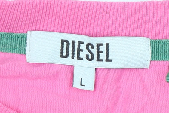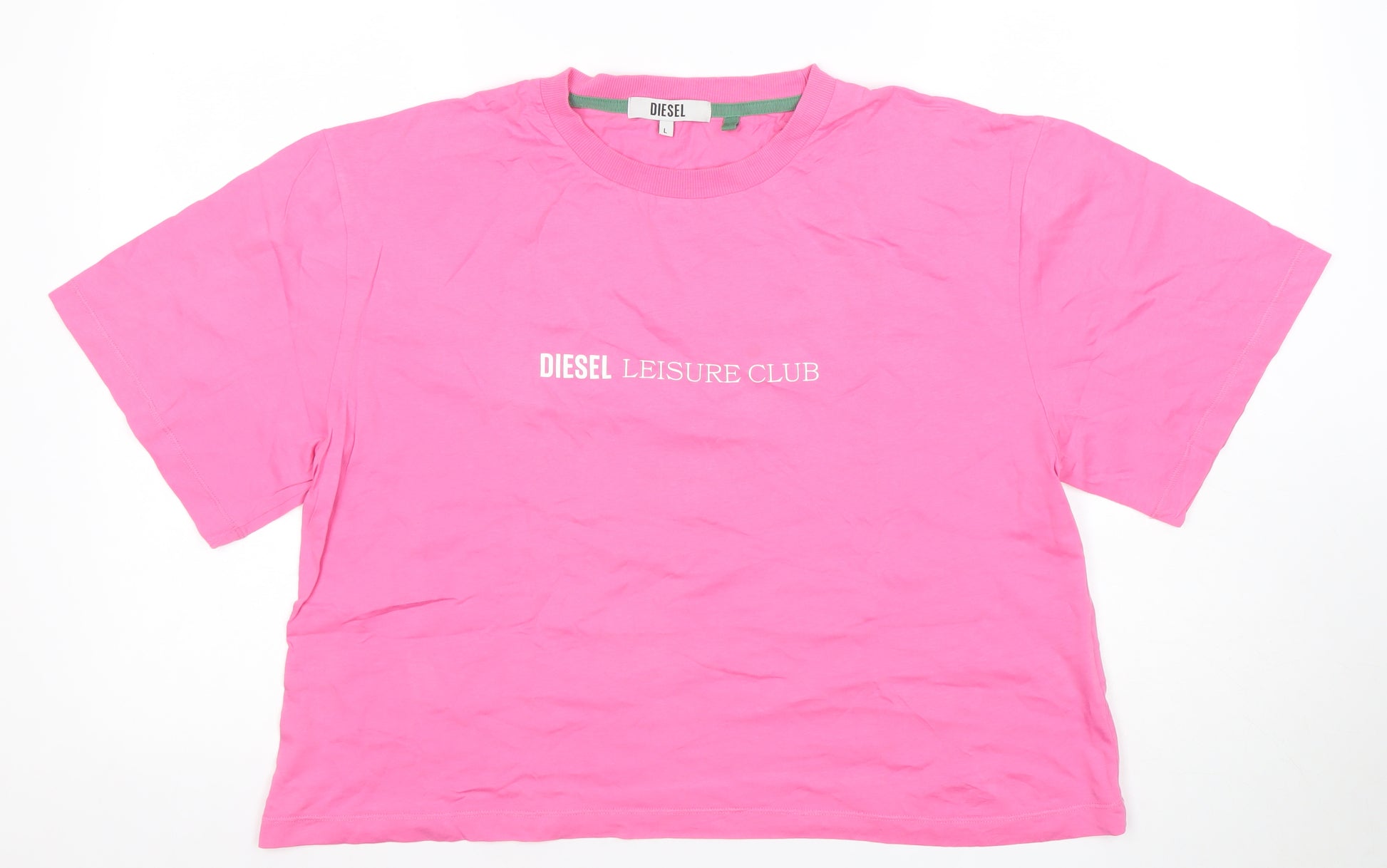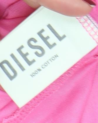 Refresh your off-duty wardrobe with this striking Diesel Women's Leisure Club T-Shirt in a vibrant pink hue. Crafted from soft 100% cotton jersey, this top delivers a breathable and lightweight feel that’s perfect for laid-back days or casual outings. The relaxed fit ensures comfort and freedom of movement, while the short sleeves and classic crew neckline create a timeless silhouette that flatters every figure. Featuring the signature 'Diesel Leisure Club' logo emblazoned across the chest, it brings effortless designer appeal to your everyday style. This T-shirt pairs beautifully with jeans, shorts, or a denim skirt for easy weekend wear. The quality cotton fabric promises long-lasting comfort and durability, ideal for seasons like spring and summer. Designed in a regular women’s size large, it gives a modern, relaxed look suitable for a variety of casual occasions. Whether for lounging, travel, or weekend adventures, this Diesel tee adds a playful yet sophisticated pop of colour to your wardrobe. In excellent used condition with only minimal signs of previous wear and some light creasing, it maintains a nearly-new appearance and feels soft to the touch. Machine washable for convenience, it’s a low-maintenance, high-style essential. Ideal for those who appreciate a mix of premium branding and comfort, this Diesel Leisure Club T-shirt captures a sporty yet luxurious aesthetic. Make this versatile pink piece your new favourite go-to for chic casual styling that transitions effortlessly from home relaxation to street-ready fashion.