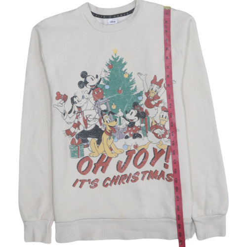 Spread festive cheer with this delightful Disney at George women's Christmas sweatshirt. Crafted in a soft beige fleece fabric, this cosy pullover features an adorable graphic of beloved Disney characters—Mickey Mouse, Minnie Mouse, Donald Duck, Daisy Duck, Goofy, and Pluto—celebrating around a Christmas tree. The cheerful ‘Oh Joy! It’s Christmas’ slogan is accented with a touch of glitter, bringing seasonal sparkle to your winter wardrobe. Designed in a comfortable regular fit with long sleeves and a classic crew neckline, it’s perfect for layering during the colder months. Made from a warm and breathable cotton-polyester blend, this sweatshirt offers soft durability with easy-care practicality. Ideal for casual festive gatherings, lounging at home, or wearing to Christmas events, it provides a fun and nostalgic vibe. The lightweight fleece-backed interior ensures comfort throughout the day, while the ribbed cuffs and hem maintain shape wear after wear. In a flattering size small (UK 8–10), this piece combines style, comfort, and Disney magic, making it a perfect addition to your seasonal wardrobe. Pair it with jeans or leggings for a relaxed winter look that still makes a statement. Whether you’re buying it for yourself or as a thoughtful gift for a Disney fan, this sweatshirt is sure to spread joy throughout the holiday season. The piece is in excellent pre-loved condition, showing only light wear to the print, consistent with minimal use. A charming must-have for Disney lovers who appreciate festive fashion.