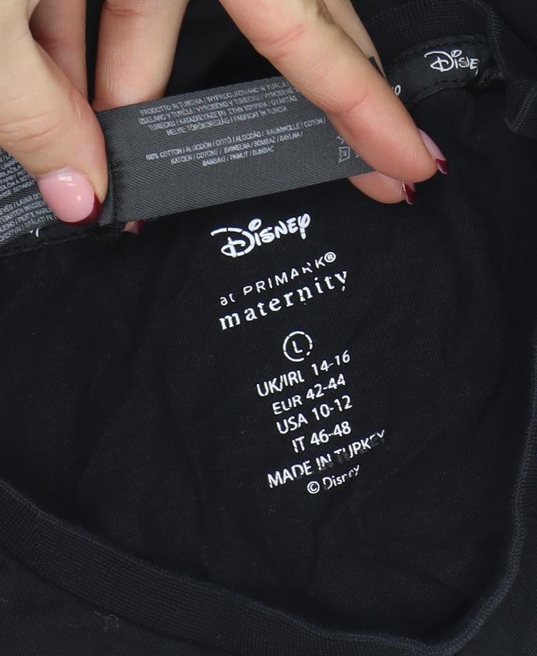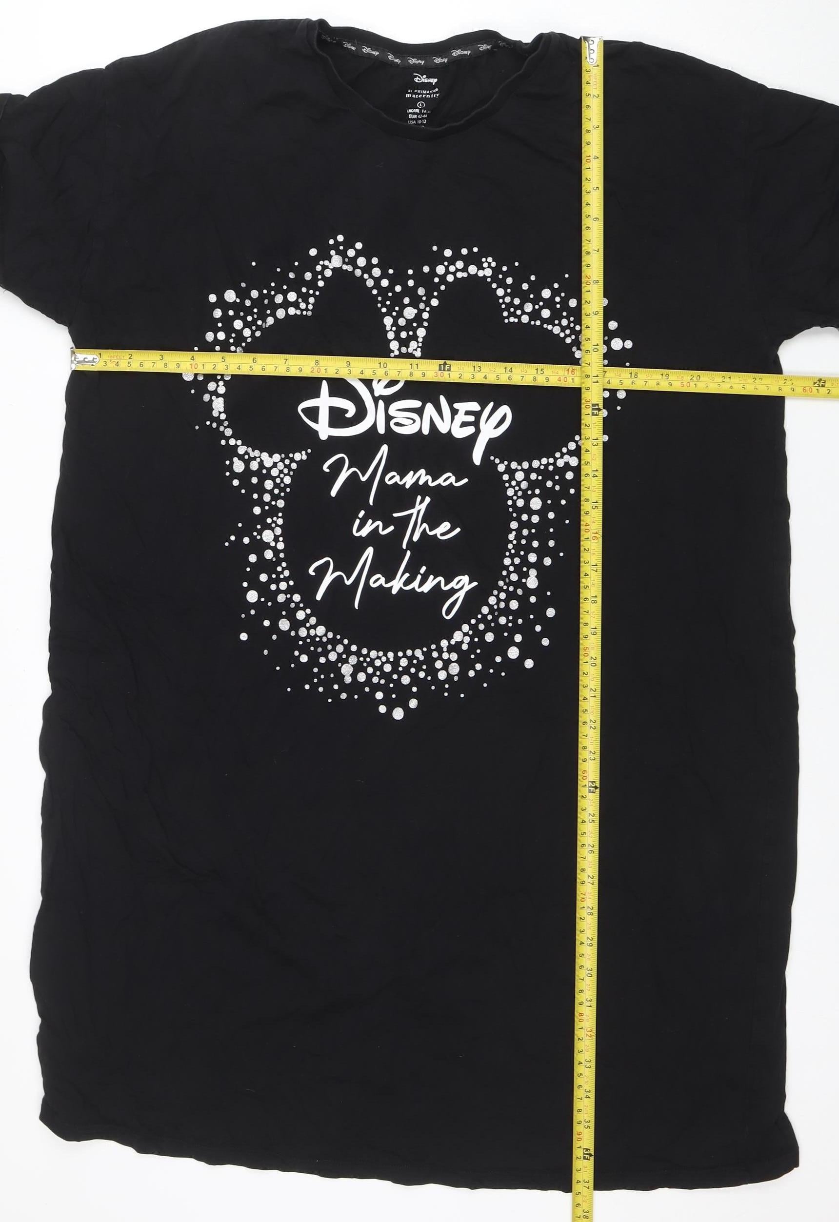 This delightful Disney at Primark women's maternity nightshirt in classic black offers comfort and character for mothers-to-be. Crafted from a soft and breathable cotton jersey with a slight stretch, it provides freedom of movement and a relaxed fit that adapts easily to your growing bump. The piece is fashioned in a traditional T-shirt nightshirt silhouette, making it an easy choice for sleeping or lounging around the house. The front design features an iconic Mickey Mouse silhouette, framed by playful white dot detailing, and bold text that reads 'Mama in the Making', adding a touch of humour and charm to your maternity wear collection. Made predominantly from 95% Cotton blended with 5% Elastane, this nightshirt ensures a cosy, lightweight, and flexible wear that is gentle on the skin. Its smooth jersey fabric makes it breathable and suitable across multiple seasons – whether layering it with a robe in autumn or wearing alone through warmer nights in spring and summer. The crew neckline and short sleeves provide a simple yet flattering cut that keeps you cool while offering a relaxed, easy-to-wear look.Although pre-loved, the item remains in very good condition with minimal signs of wear and no visible flaws or damage. The garment care label confirms that it is machine washable for convenient maintenance, ensuring that it stays fresh and comfortable even with regular use.Perfect for expectant mothers who value both comfort and a hint of Disney magic, this maternity nightshirt is an ideal addition to your sleepwear rotation. It offers everyday practicality paired with a touch of nostalgia and cheer. Whether you’re treating yourself or gifting a mum-to-be, this Disney maternity nightshirt promises to make bedtime just a bit more magical.