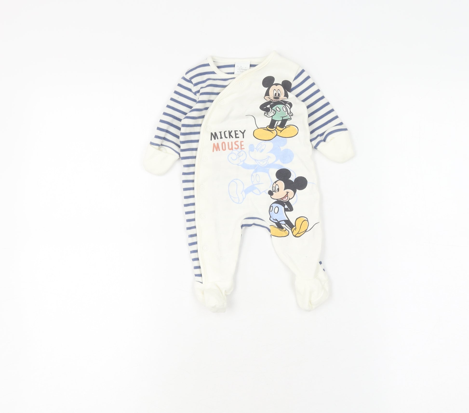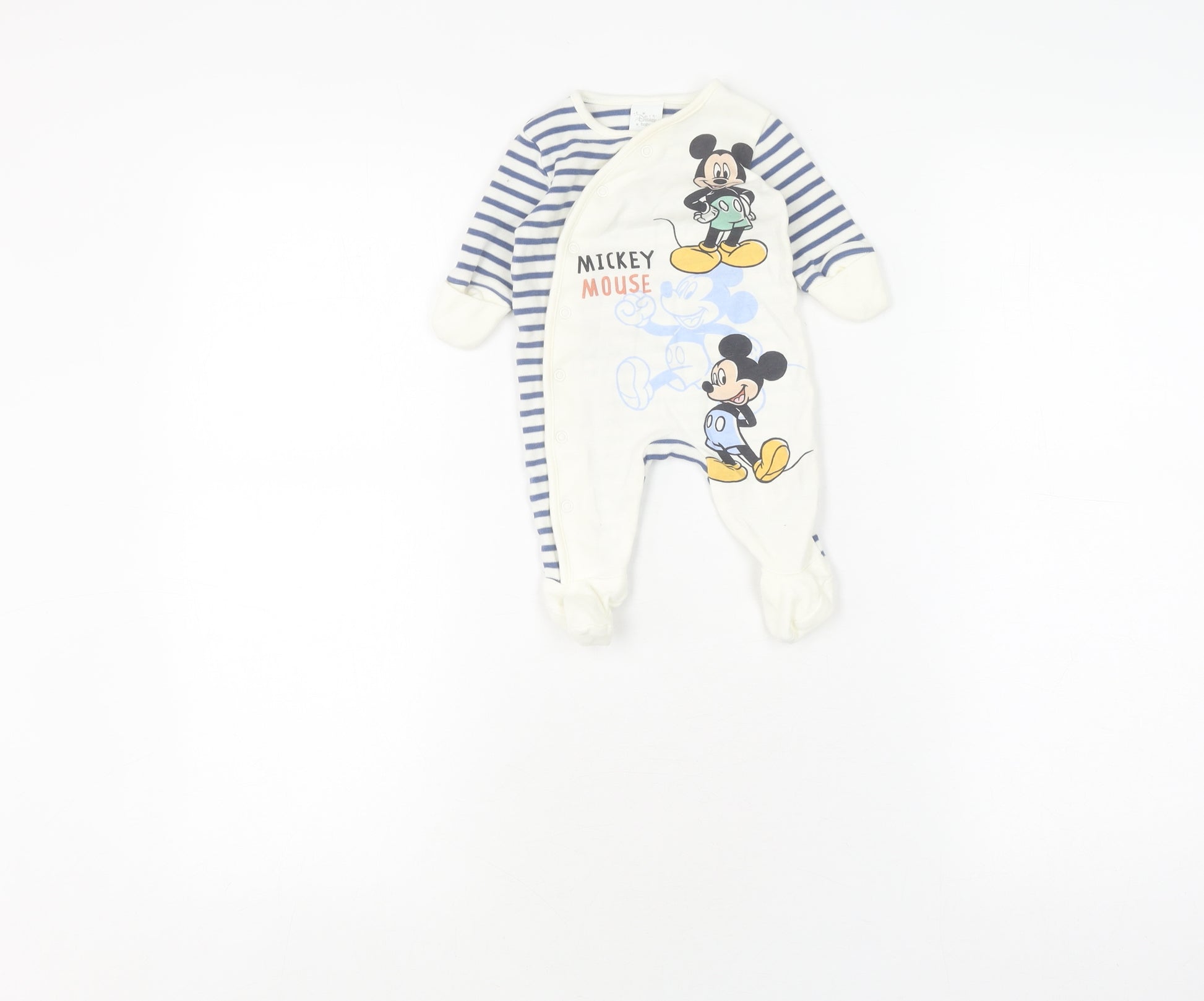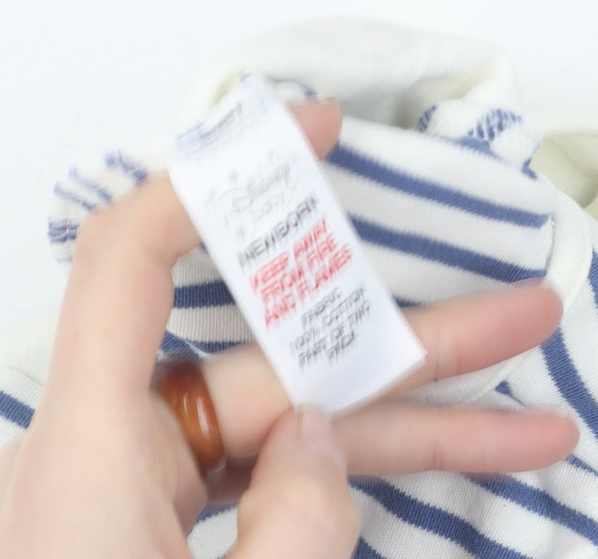 Adorn your little one in the charm of Disney with this adorable newborn babygrow. Ideal for both boys and girls, this delightful piece showcases the beloved Mickey Mouse character, bringing a sense of magic to everyday wear. Its classic blue and white striped pattern is wonderfully accented with an embroidered design, giving it a playful yet elegant look. Crafted from 100% cotton, this babygrow promises your baby the ultimate in softness and comfort, perfect for all-day cuddling and napping. The durable jersey fabric is easy to care for, being machine washable for convenient maintenance - perfect for busy parents. Designed for versatility, this one-piece is suitable for any season, be it spring, summer, autumn, or winter. Its long sleeves keep your baby snuggly warm, while the snap closure makes dressing and changing quick and fuss-free. While presenting in excellent condition, this babygrow lacks its original sales tags, offering a pre-loved charm that appeals to eco-conscious consumers. Whether it’s for casual day wear or a delightful gift for a loved one, this Disney baby babygrow combines practicality with the timeless enchantment of Disney, ensuring it becomes a cherished piece in any baby’s wardrobe.