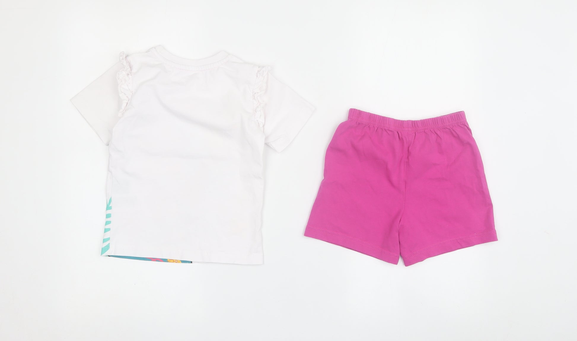 Delight your little one with this adorable Disney Encanto pyjama set, featuring the beloved character Mirabel. Perfect for girls, this vibrant multicoloured set is designed with her comfort in mind. Made from 100% cotton, the fabric is soft against the skin and ensures a cosy night's sleep. The short sleeve top is ideal for all seasons, allowing for breathability during warmer nights while easily layering under robes for winter warmth. The vibrant graphic print celebrates her favourite cartoon character from the Encanto movie, bringing a touch of magic to bedtime. This set includes a top that features a pullover closure for ease of dressing and shorts for comfort. With a lightweight knit fabric that is machine washable, it’s great for active kids on the go. Made for ages 3-4 years, it’s an excellent gift choice that combines practicality with fun. The pyjama set is new with tags, reflecting its pristine quality, perfect for any little fan of the enchanted world of Encanto. Surprise her with nightwear that she'll love, and make her dreams even more magical.