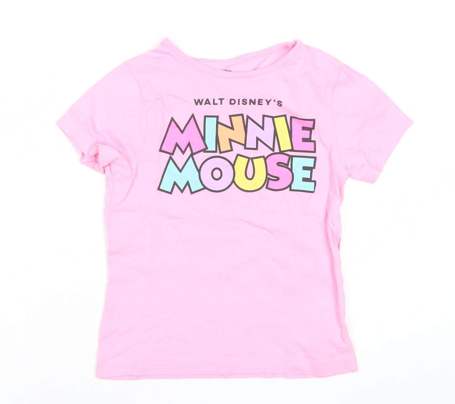Brighten up your little one’s wardrobe with this adorable Disney Girls Minnie Mouse T-Shirt, perfect for casual days, playtime or school wear. Designed in a cheerful pink shade, this T-shirt is adorned with colourful, bold ‘Minnie Mouse’ text across the front, making it a fun and eye-catching piece for young Disney fans. Its lightweight jersey fabric blend of cotton, polyester and viscose ensures comfort throughout the day while also being easy to care for, machine washable and durable for everyday activities. The short sleeves and classic crew neck design provide a relaxed fit that’s ideal for layering or wearing alone, making it suitable across spring, summer and early autumn seasons.Perfectly sized for girls aged 5-6 years (116 cm), this T-shirt is cut in a regular fit with a soft pullover style closure, ensuring fuss-free dressing. Parents will love how versatile and practical this piece is, suitable for school, playdates or lounging, while children will enjoy showing off their favourite Disney character. The playful graphic print adds personality to every outfit while maintaining the comfort of a classic tee.Although pre-loved, this T-shirt remains in very good condition with no stains, holes or major signs of wear, though it does not include original store tags. Light creasing may be noticed but will easily refresh with washing or ironing.Whether you’re looking for a fun everyday staple or a special Disney-themed item for your child, this lovely pink Minnie Mouse T-shirt is an affordable and charming choice, guaranteed to put a smile on any Disney fan’s face. Add it to their collection today for an easy-to-style must-have piece that combines comfort, playfulness and character appeal.
