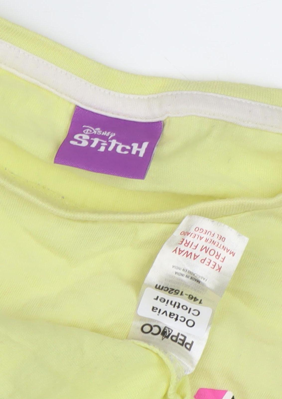 This delightful Disney Stitch T-shirt in a sunny yellow colour is perfect for girls aged 14-15 years. Made from soft and breathable cotton, it ensures comfort during casual outings or fun-filled activities. The short sleeve design and round neckline offer a relaxed fit, while the playful Stitch graphic print adds a touch of whimsy to any outfit. Perfect for fans of the beloved Disney character, this tee makes a great addition to their wardrobe. Ideal for spring and summer wear, it's machine washable for easy care. Though a small stain is visible on the back, this doesn't detract from the overall charm of the shirt. Whether paired with jeans or shorts, this T-shirt is a versatile and fun fashion choice!