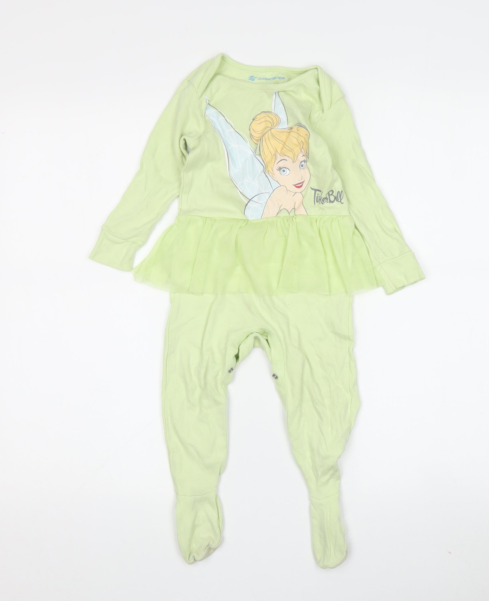 This adorable Disney Tinker Bell babygrow is perfect for your little fairy fan. Crafted from comfortable 100% cotton with a polyester frill, this green one-piece features a charming Tinker Bell graphic that will delight any child who loves fairy tales. Suitable for babies aged 12-18 months, it serves as a versatile outfit for both casual days and special parties. The snap closure ensures easy changing, while the long sleeves provide warmth and coverage in all seasons. Designed with ease of care in mind, this machine washable babygrow makes for a practical yet whimsical addition to your child’s wardrobe. Despite being pre-loved, it remains in excellent condition, with minor signs of wear around the feet, ready to capture the magic of Disney in everyday moments. Capture imagination with this enchanting piece today!