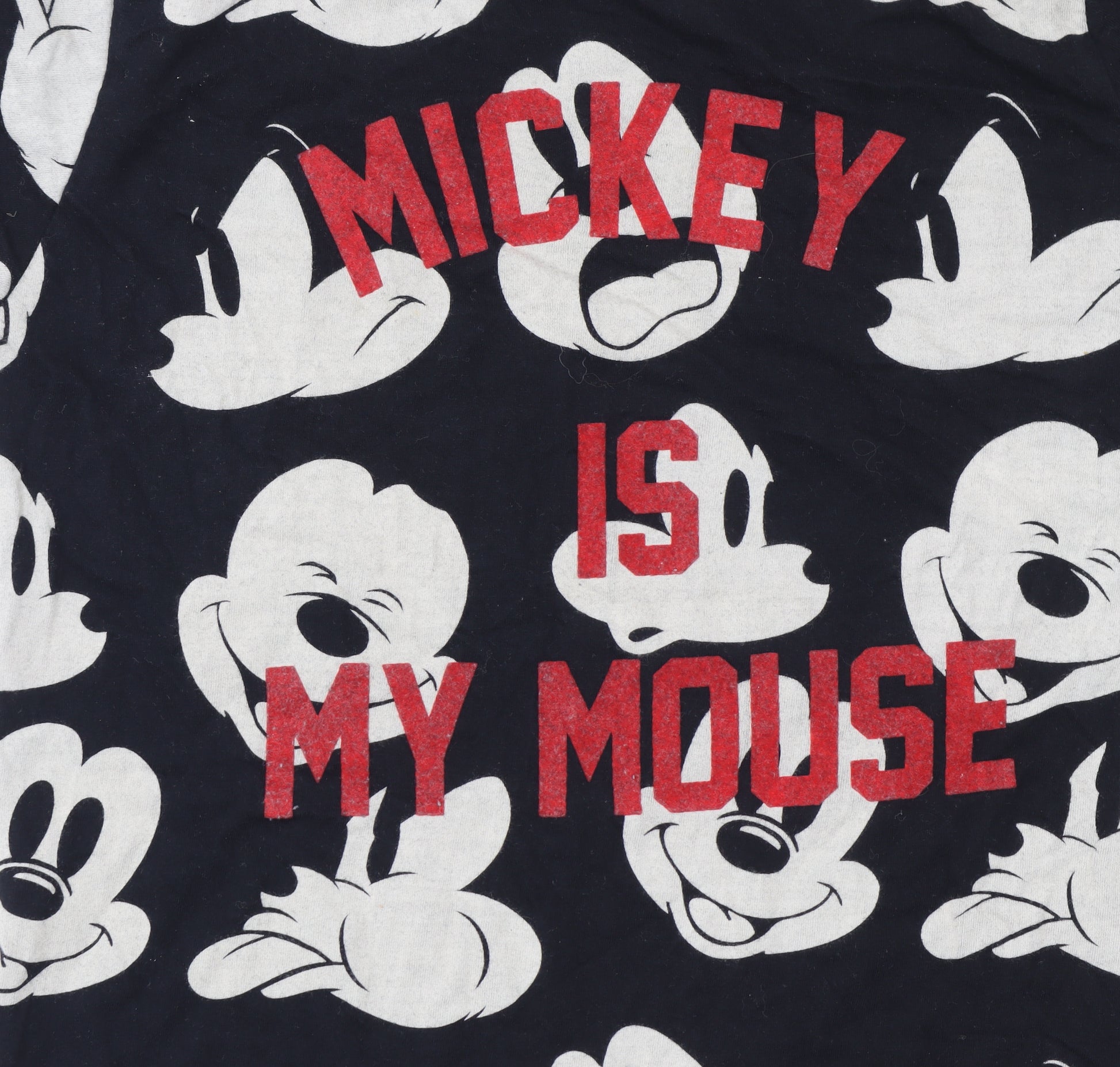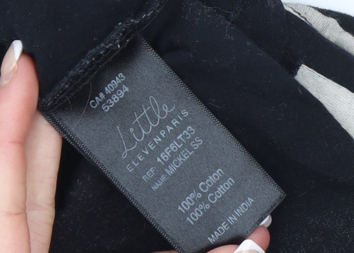 Bring a touch of Disney magic to your child's wardrobe with this adorable Little Eleven Paris 'Mickey Is My Mouse' T-shirt for girls. Crafted from soft and breathable 100% cotton, this comfortable everyday piece is ideal for casual wear all year round. The striking black jersey fabric features an all-over cream Mickey Mouse face print, contrasted with bold red glitter text that reads 'Mickey Is My Mouse' across the front. Its short sleeves and classic crew neckline make it perfect for layering or wearing on its own in warmer weather.Designed with quality in mind, this officially licensed Disney top blends comfort and fun, making it a firm favourite for any young Disney fan. The lightweight jersey material feels soft against the skin, ensuring breathability and all-day comfort whether worn to school, on playdates, or during relaxed weekends. With its easy-care, machine washable fabric, maintaining the T-shirt’s vibrant design is effortless.This Little Eleven Paris piece captures effortless French style with playful character charm, combining trendy design with nostalgic Disney appeal. The glitter detailing on the chest adds a fun, sparkling touch that kids will love without compromising on comfort. Suitable for spring, summer and autumn wear, it’s versatile enough to pair with jeans, leggings, or shorts for an easy everyday outfit.In excellent pre-loved condition, this T-shirt shows minimal signs of use and retains its bright colours and soft feel, though no original retail tags are present. Perfect for fans of Mickey Mouse and classic cartoons, it's a cheerful, stylish addition to any young girl’s collection — ideal for gifting or everyday wear. Experience the blend of comfort, quality, and charm that makes Little Eleven Paris x Disney collaborations so special.
