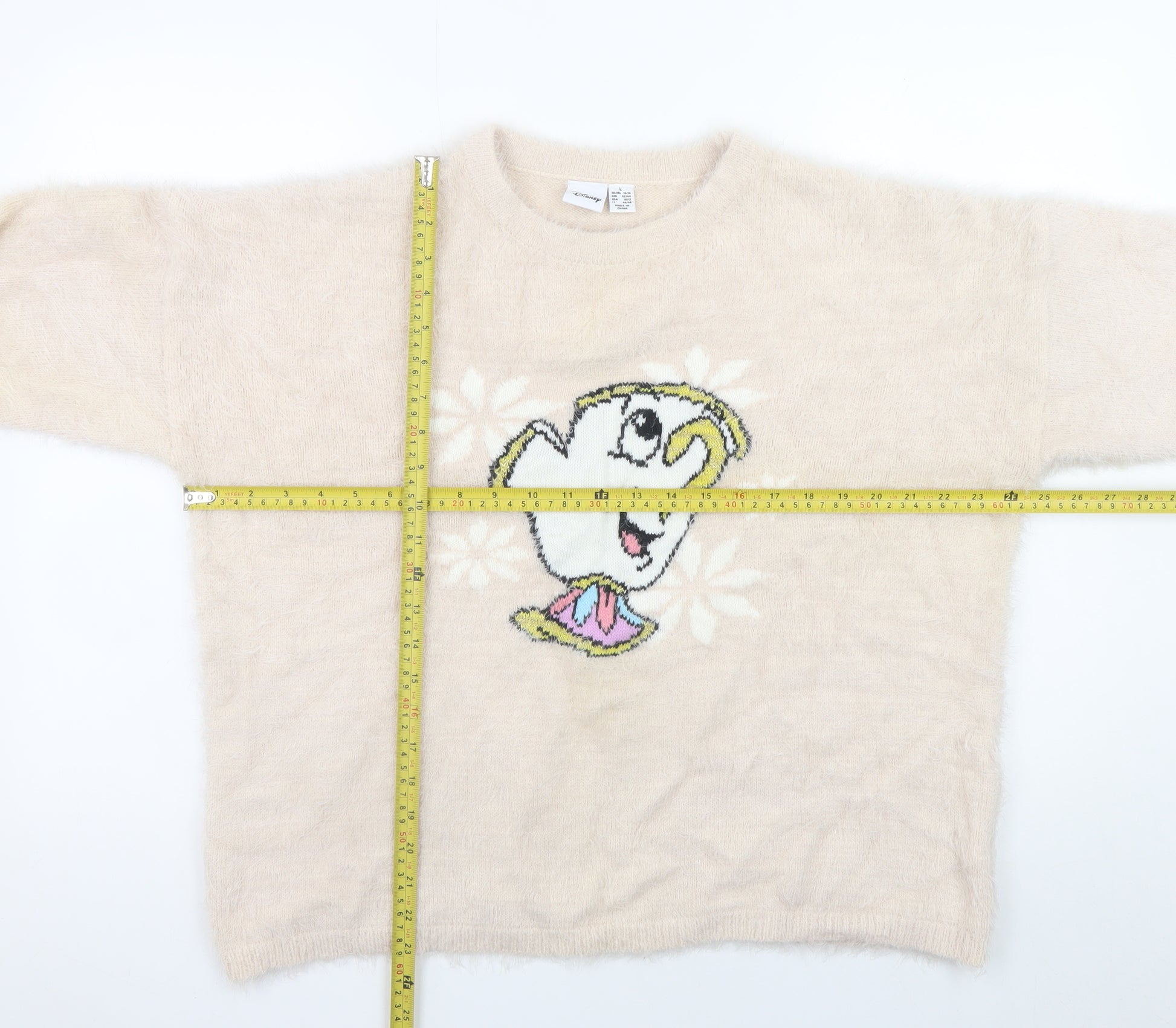 Add a touch of magic to your wardrobe with this soft and charming Disney women's jumper featuring Chip from Beauty and the Beast. Made from a cosy blend of nylon and acrylic, this beige pullover offers a lovely fluffy texture and a relaxed, comfortable fit perfect for cooler days. The charming design brings a playful nostalgic feel, while the neutral tone allows it to pair beautifully with jeans, skirts, or casual trousers for an effortlessly stylish look. Designed with a classic crew neckline and long sleeves, it’s an easy-to-wear piece that combines comfort with character. Ideal for everyday casual wear, lounging, or embracing a touch of Disney fun, this jumper feels both lightweight and warm — great for layering during the autumn and winter seasons. The quality knit fabric provides slight stretch for ease of movement, and its soft fibres offer warmth without heaviness. With its adorable embroidered graphic of Chip and timeless Disney detailing, this pullover jumper is a must-have for fans who love blending comfort and character. Whether you’re curling up at home or heading out for a casual day, it’s a cheerful and cosy addition to your collection. Machine washable for easy care, it’s made to stay soft and wearable wash after wash. Excellent pre-loved condition with minimal signs of wear ensures great value and longevity. Treat yourself or delight a Disney fan with this stylish jumper that perfectly balances fun and fashion. Enjoy warmth, comfort, and classic animated charm in one wearable piece of nostalgia.