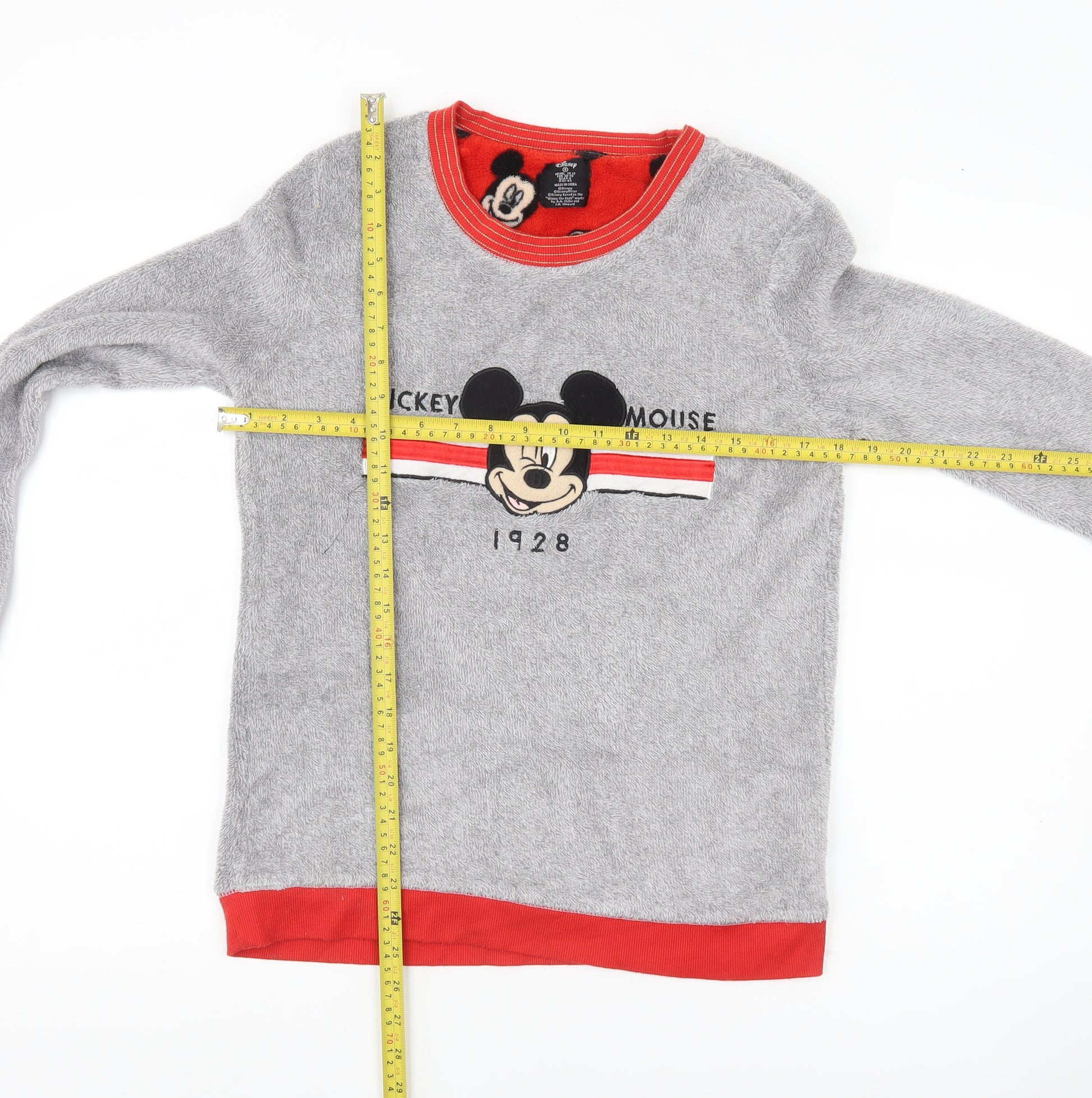 Stay cosy and stylish with this official Disney women’s pyjama top, perfect for adding a touch of fun and comfort to your nightwear collection. Crafted from soft fleece fabric, this grey long sleeve top is made from 100% polyester, ensuring warmth and durability while still being lightweight enough for lounging. The playful design features a bold embroidered Mickey Mouse motif with classic red and white stripe details and the iconic year “1928,” making it a must-have piece for Disney fans. This pyjama top is cut in a flattering regular fit and comes in a UK size 10-12, ideal for those who love their nightwear to feel both comfortable and stylish. The crew neckline, accented with a striking red trim, matches the cuff and hem details, adding a contrasting pop of colour to the soft grey fleece body. Perfect for autumn and winter, this cosy Disney top is designed to keep you warm on chilly nights while maintaining a fun, relaxed look.Whether worn as part of a matching lounge or pyjama set, or simply on its own with your favourite pyjama bottoms, this top is versatile enough to fit into any sleepwear wardrobe. The embroidered detail brings a unique, quality finish that Disney collectors and fans of Mickey Mouse will adore. Machine washable for easy care, it’s both practical and stylish.The item is in very good pre-loved condition with minimal signs of wear, showing only light use and some minor fluffing consistent with its fabric type, without detracting from its great overall look. A wonderful option for gifting a Disney lover or simply treating yourself to a bedtime upgrade, this top captures both comfort and character in one piece.Bring a little Disney magic to your evenings with this delightful pyjama top, combining comfort, fun, and timeless style in a way only Mickey Mouse can.