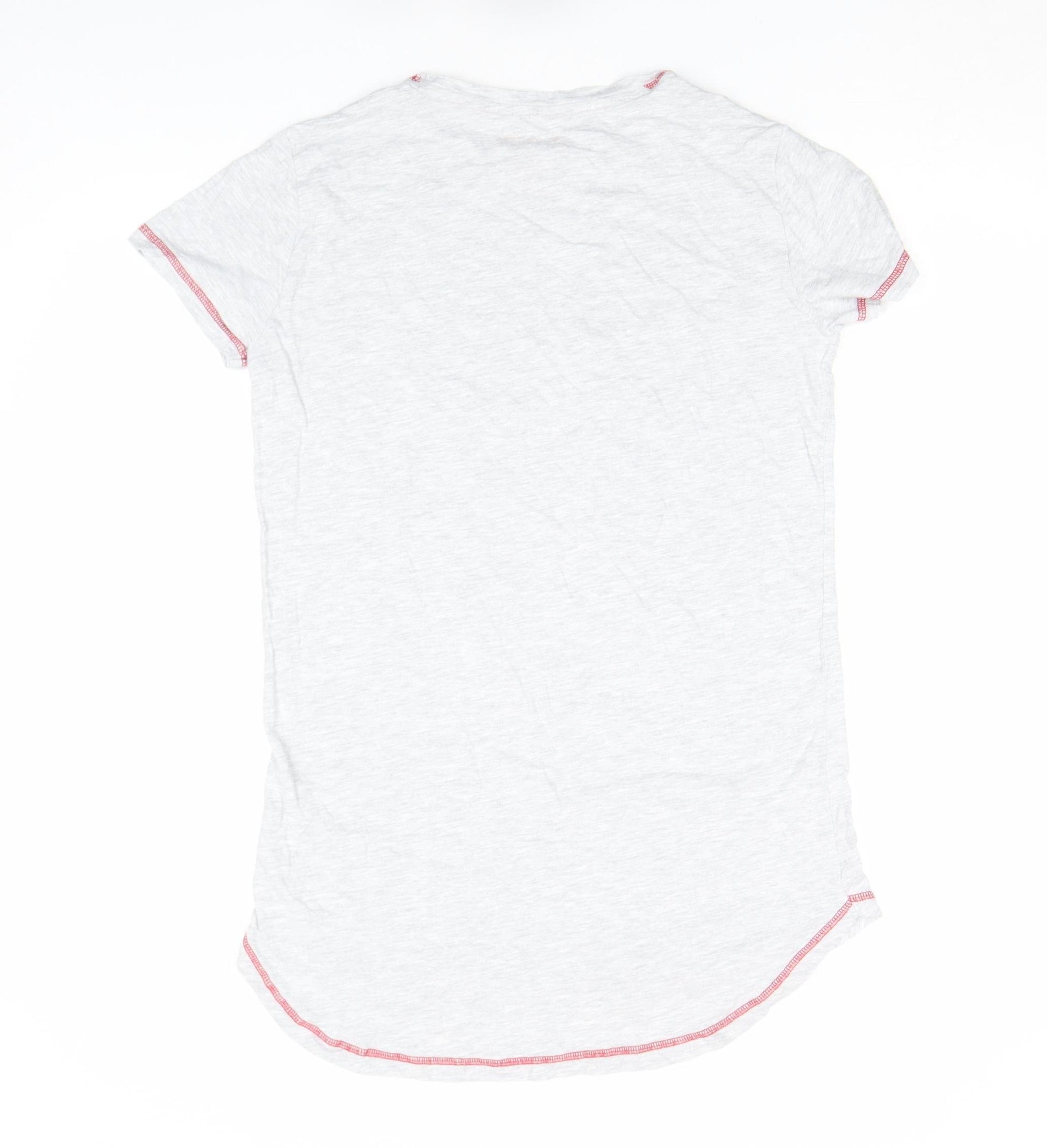 Settle in for a perfect night’s sleep with this delightful Disney women’s Mickey Mouse nightshirt. Crafted from soft 100% cotton jersey, this lightweight and breathable nightwear piece offers a relaxed, comfortable fit, making it ideal for lounging or sleeping. In a soft grey shade accented by red stitching, it features a cheerful Mickey Mouse graphic accompanied by a humorous slogan that adds a fun, playful touch to your bedtime routine. Designed with a crew neckline and short sleeves, this T-shirt style nightshirt ensures easy movement and a casual, laid-back feel. The longer curved back hem provides a flattering silhouette with added coverage. Its machine washable cotton fabric makes caring for this nightshirt effortless, keeping it fresh and soft for daily wear. Perfect for spring and summer seasons, this cosy Disney nightshirt merges comfort with nostalgia and humour, appealing to true Disney lovers. Whether as a treat for yourself or a thoughtful gift, it captures timeless character charm with modern comfort, ensuring joyful dreams and relaxed nights. In excellent pre-loved condition, showing minimal wear and no visible flaws, this piece comes ready to enjoy once more. Experience maximum comfort with minimal fuss—add this beloved grey Mickey Mouse nightshirt to your bedtime collection today for effortless style and authentic Disney fun.