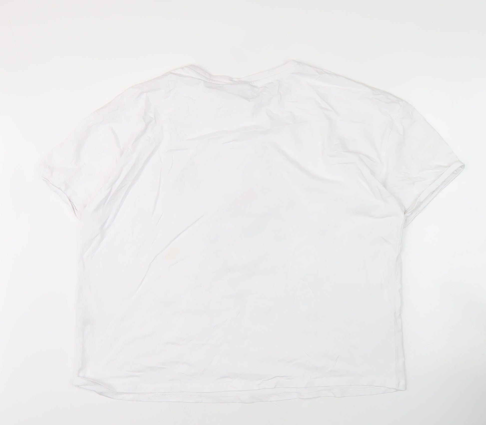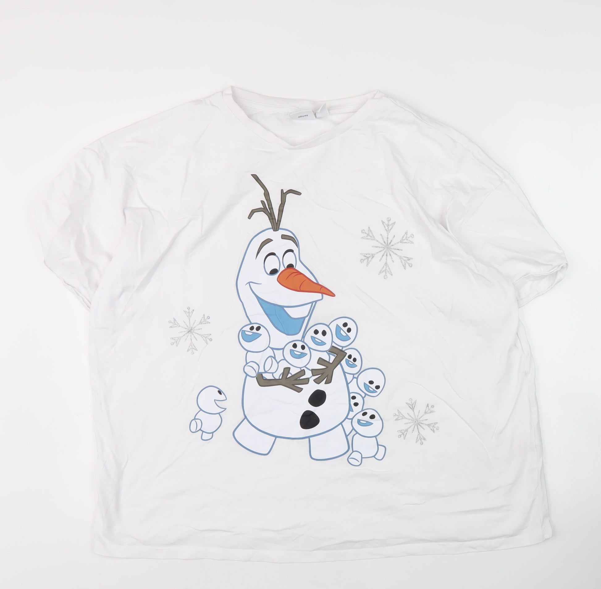 Indulge in the magic of Disney with this women's white Frozen T-shirt. Crafted from 100% cotton, it ensures comfort and breathability, making it an ideal choice for lounging or casual wear. Designed for women, this regular fit shirt comes in size 16. Showcasing the beloved character Olaf from the iconic movie, it is guaranteed to bring a smile to your face. The graphic print adds a playful touch while maintaining a stylish look. Short sleeves ensure ease of movement, perfect for layering or standalone wear in various temperatures. Part of the celebrated Disney character family, this shirt is a must-have for fans of the Frozen franchise. Its machine washable feature makes it easy to care for, adding to its practicality. Although gently used with slight creasing, it remains in good overall condition. Experience a piece of Disney magic while enjoying comfort and style, making it a delightful addition to any wardrobe.
