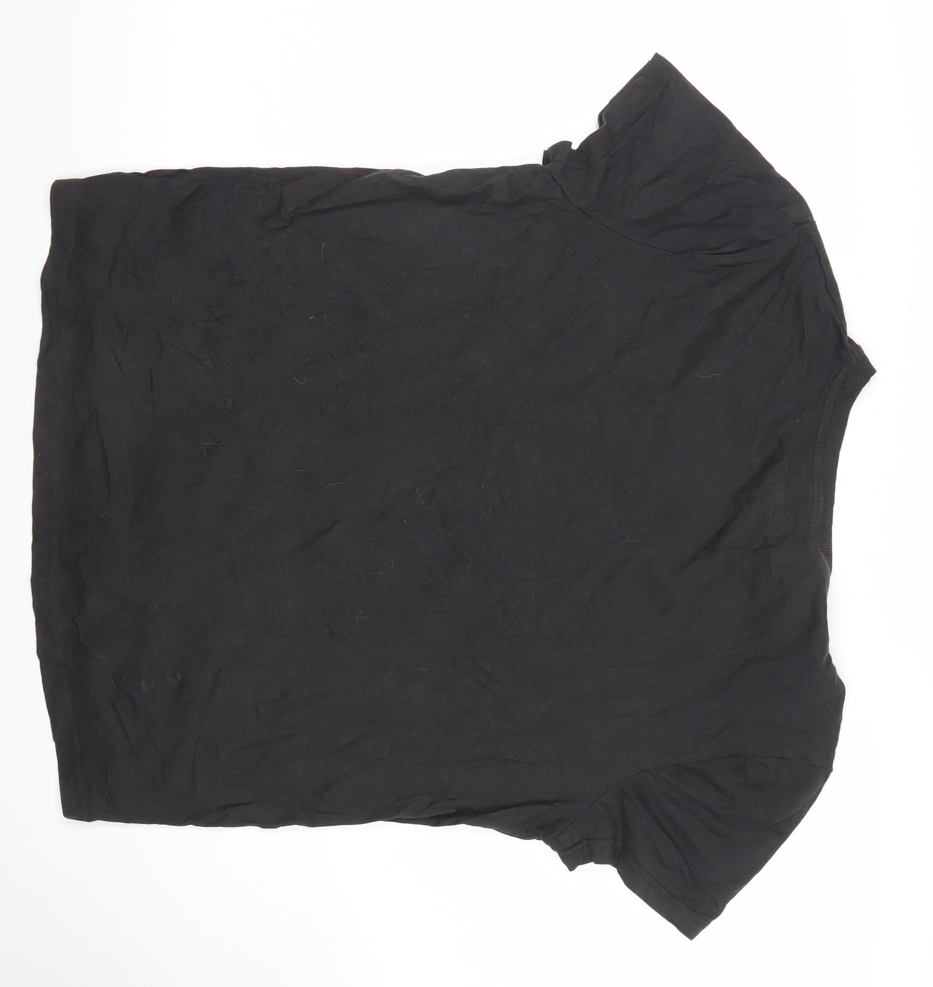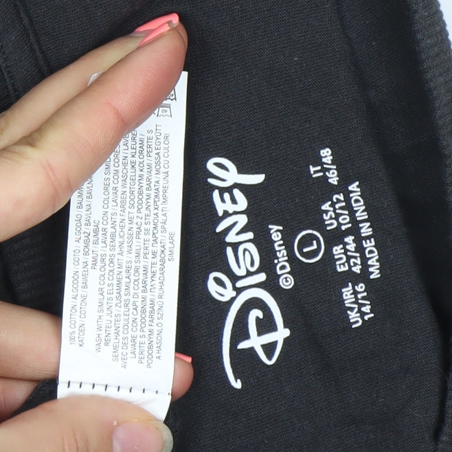 Bring a touch of nostalgic Disney magic to your nightwear collection with this women's black Fantasia nightshirt featuring Mickey Mouse in his iconic Sorcerer’s Apprentice costume. Crafted from 100% soft cotton jersey, this lightweight and breathable short-sleeved top offers ultimate comfort for lounging or sleeping. Designed in a relaxed T-shirt style, it combines casual charm with playful character appeal. The black base is beautifully contrasted by a glitter-accented gold logo print reading 'Fantasia', surrounded by starburst detailing for that magical touch fans love. Made by Disney, this officially branded piece reflects their renowned quality and timeless designs. The crew neckline and regular fit provide versatile comfort ideal for year-round use through spring, summer, and autumn nights. Size Large (UK 14/16) ensures a comfortable, easy fit. Whether worn as a cosy standalone nightshirt or paired with your favourite pyjama bottoms, this Fantasia piece brings character and comfort together effortlessly. Perfect for Disney enthusiasts who enjoy relaxing in style, it also makes a thoughtful gift for fans of the beloved movie classic. In very good pre-loved condition with minor creasing and light wear consistent with gentle use, it maintains excellent shape and vibrant print quality. Machine washable for easy care, this black nightshirt is a must-have bedtime favourite. Add a sprinkle of Disney enchantment to your nighttime routine with this charmed Fantasia design — ideal for lounging, movie nights, or drifting off into dreams filled with stars and sorcery. Elevate your nightwear lineup with characterful comfort and enduring Disney magic.