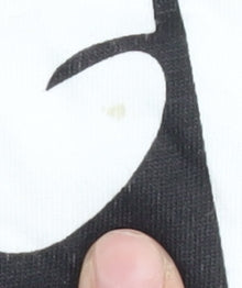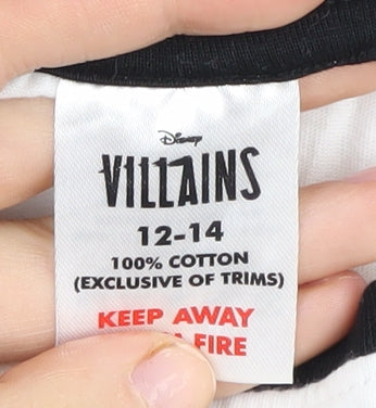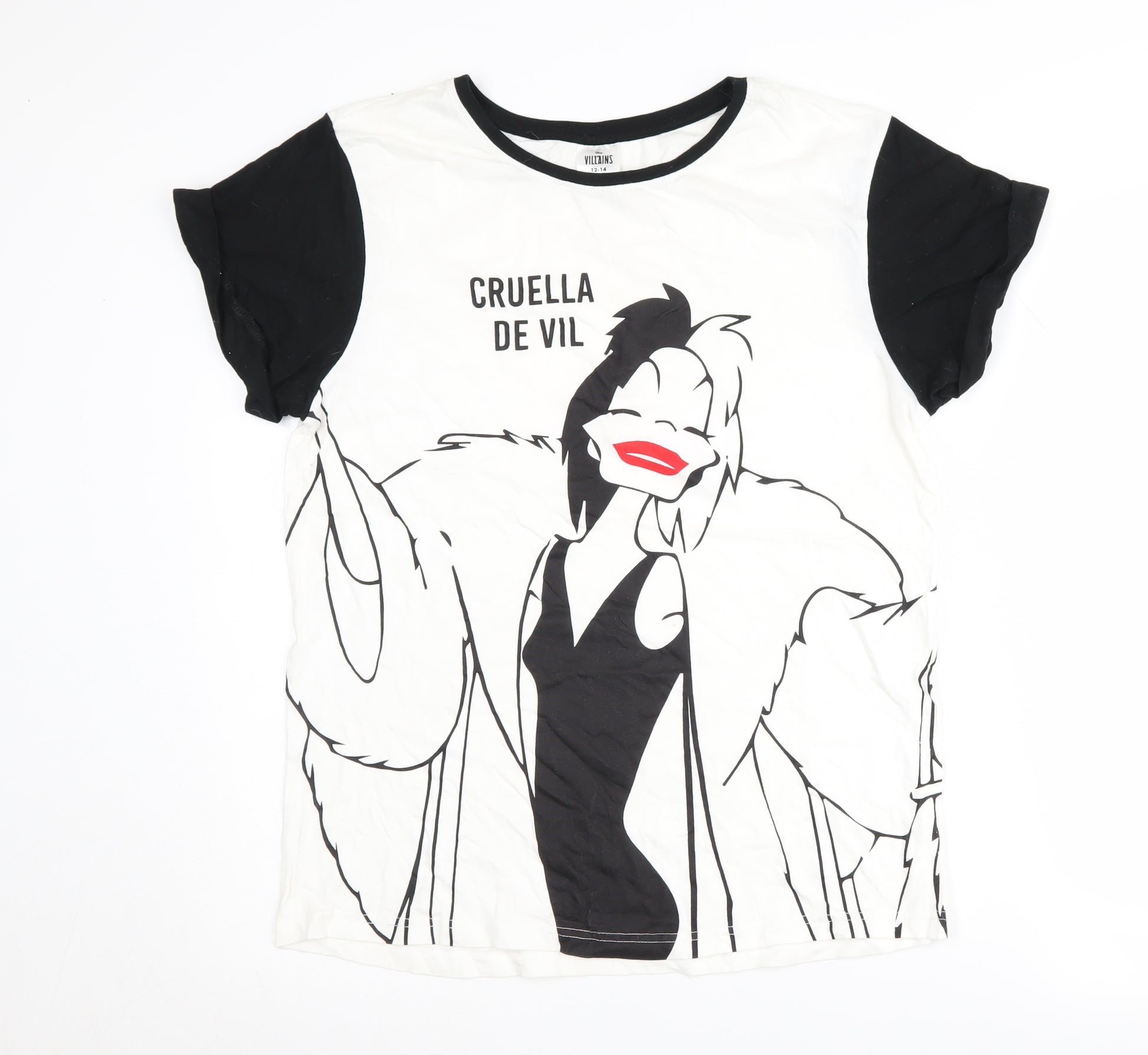 Embrace your Disney fandom with this striking Disney Villains Cruella de Vil T-shirt, perfect for casual outings or laid-back days. Crafted from 100% cotton, this comfortable and breathable top is designed for women and features an iconic graphic print of the infamous Cruella herself. The classic black and white colour scheme paired with a crew neckline and short sleeves makes it a versatile addition to any wardrobe. This regular fit t-shirt in size large offers a relaxed style with a playful edge, making it suitable for all seasons. The pullover closure ensures easy wear, while the lightweight material ensures comfort all day long. Although pre-loved, this T-shirt remains in very good condition, with a minor, small stain present on the front. Ideal for Disney enthusiasts, this trendy tee celebrates the rebellious spirit of your favourite villain. Pair it with jeans or shorts for a cool, casual look that reflects a love for all things Disney. Get ready to add a touch of nostalgia and character to your ensemble with this unique piece today.