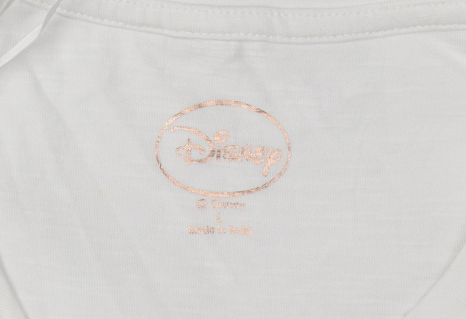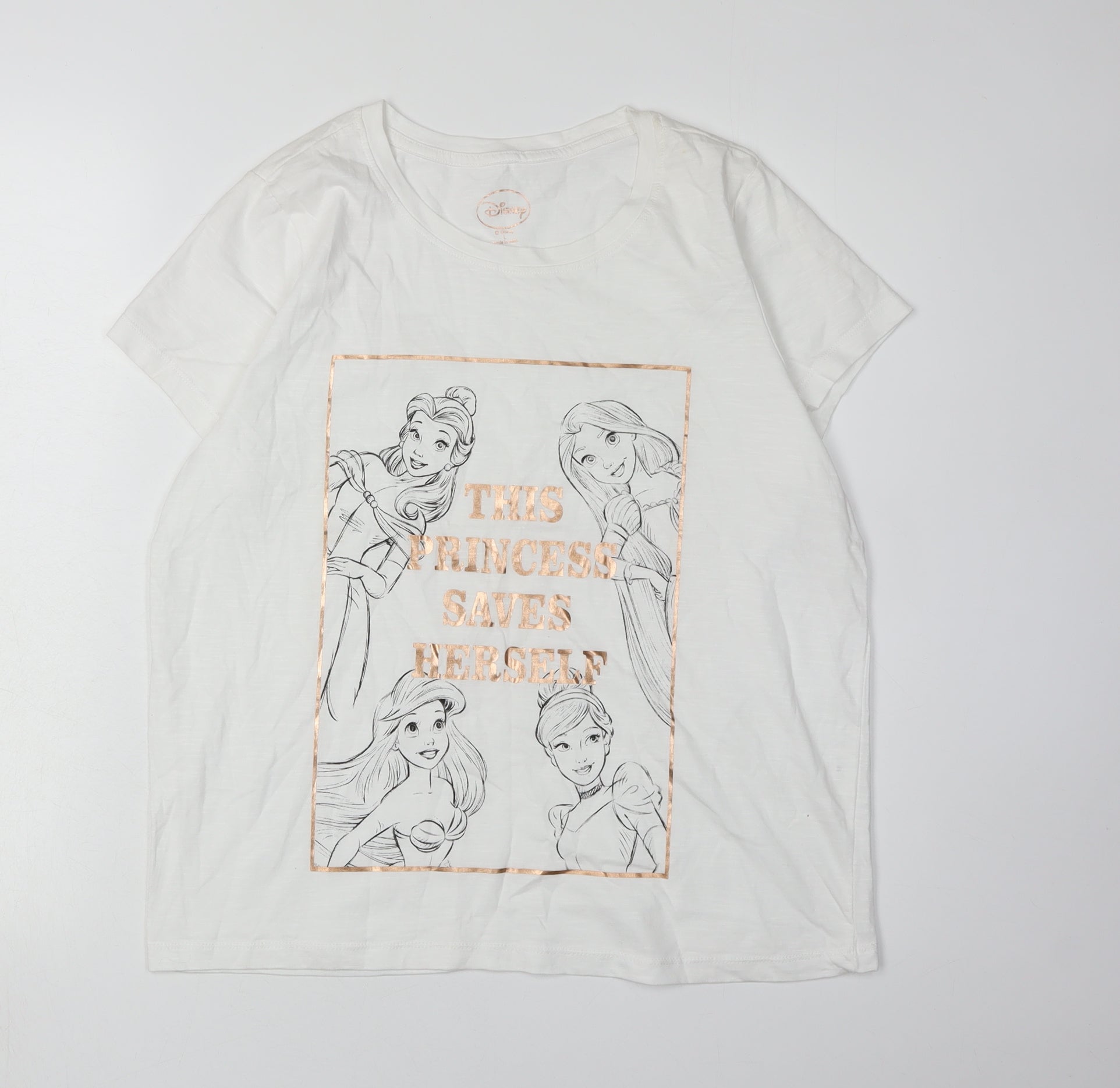 Discover a touch of magic with this Disney Women's White Princess T-Shirt. Perfectly suited for casual wear, it features a delightful princess graphic that will add charm to your wardrobe. Tailored from 100% cotton, this T-shirt is both comfortable and breathable, ideal for all seasons. Designed with a round neckline and classic short sleeves, this regular fit tee ensures a relaxed yet stylish look. The pullover closure makes it easy to wear, while the solid white colour provides a versatile base for pairing with various outfits. With machine washable convenience, maintenance is a breeze. Though pre-loved, this tee has been diligently cared for and shows only slight signs of wear, making it a fantastic addition to any closet. Whether you're channeling your inner princess or seeking a charming piece for everyday wear, this T-shirt is a delightful choice. Embrace the fantasy and share the enchanting allure of Disney magic in your day-to-day life. A perfect blend of style and comfort, it's more than just a tee; it's a whimsical statement. Grab yours now and let the princess in you shine.