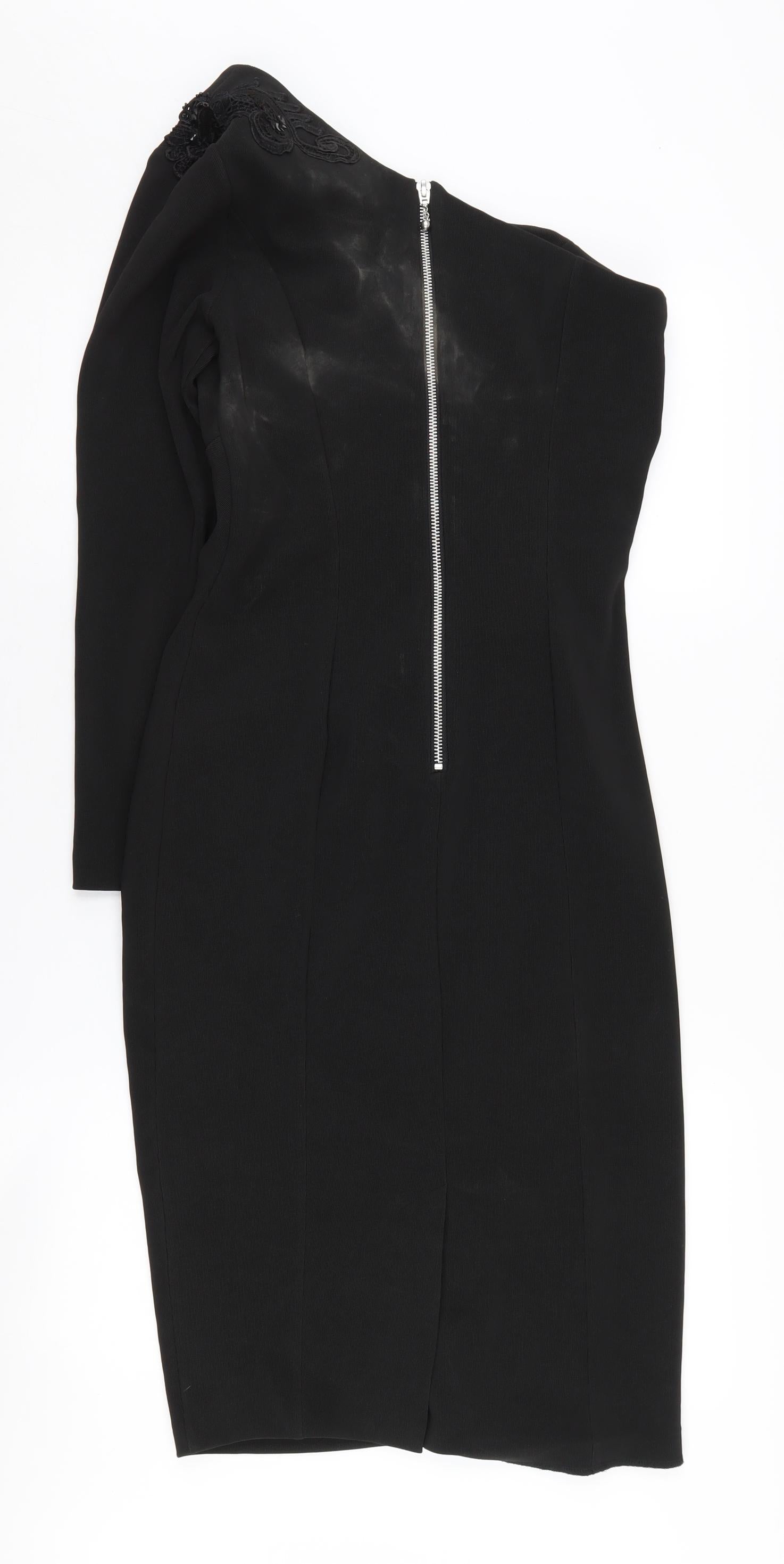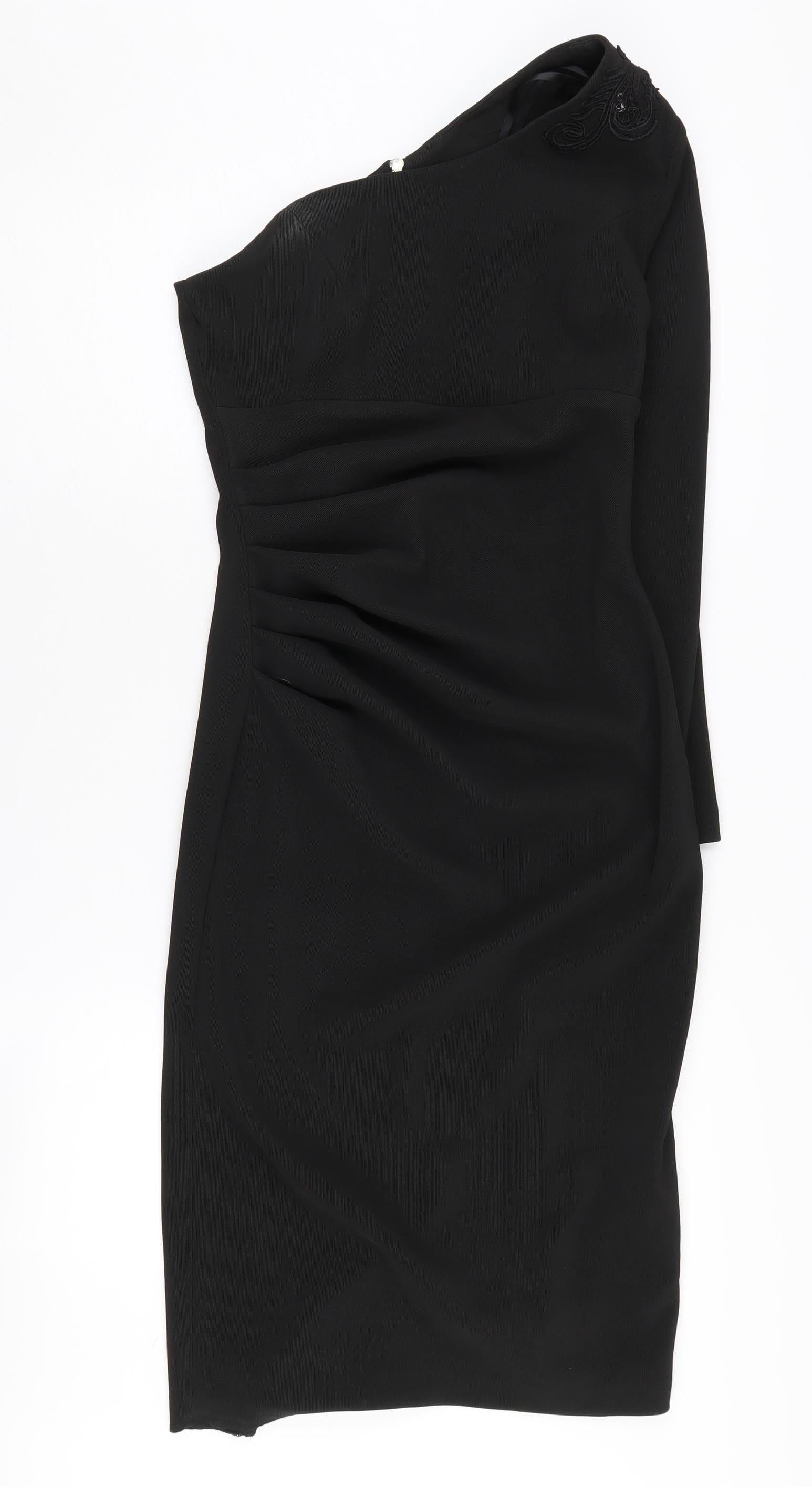 Discover an elegant addition to your wardrobe with this Diva Catwalk dress in timeless black. Crafted from a blend of polyester and elastane, it promises a flattering fit while providing comfort and stretch. Perfect for evening occasions or a sophisticated outing, this piece features a chic one-shoulder neckline and a stylish zip closure at the back. The ruched design adds a touch of texture, enhancing its classy appearance. Although in very good condition, minor white marks are present. Embrace your inner diva and make a statement in this stunning dress.