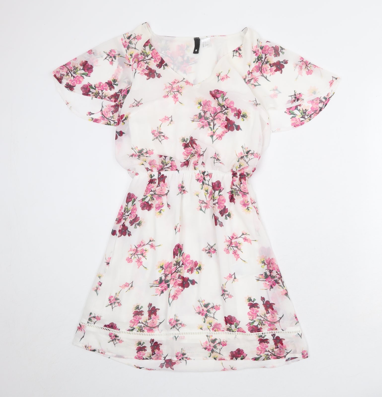 Womens White Floral Polyester Fit & Flare Size 8 V-Neck Pullover