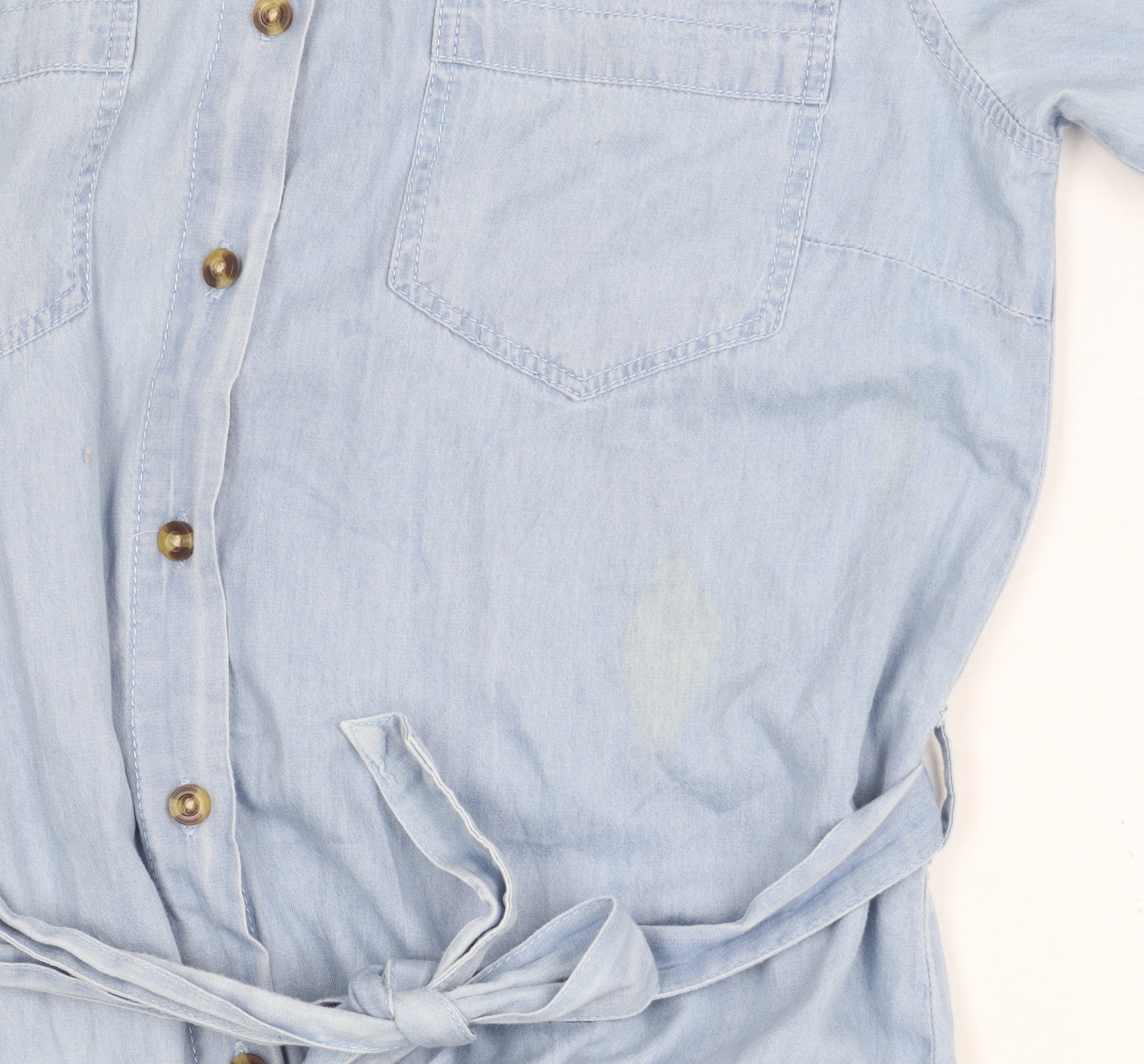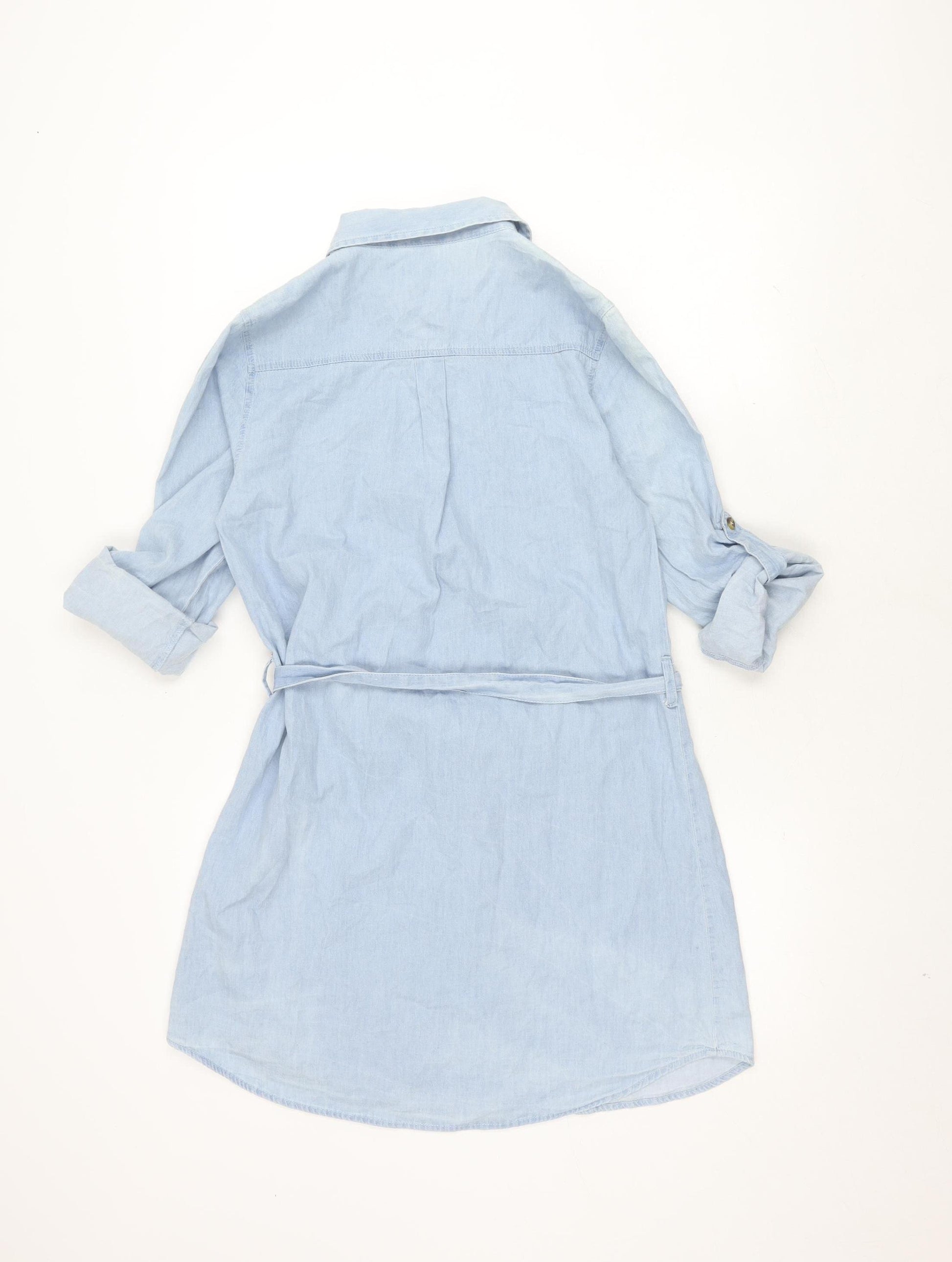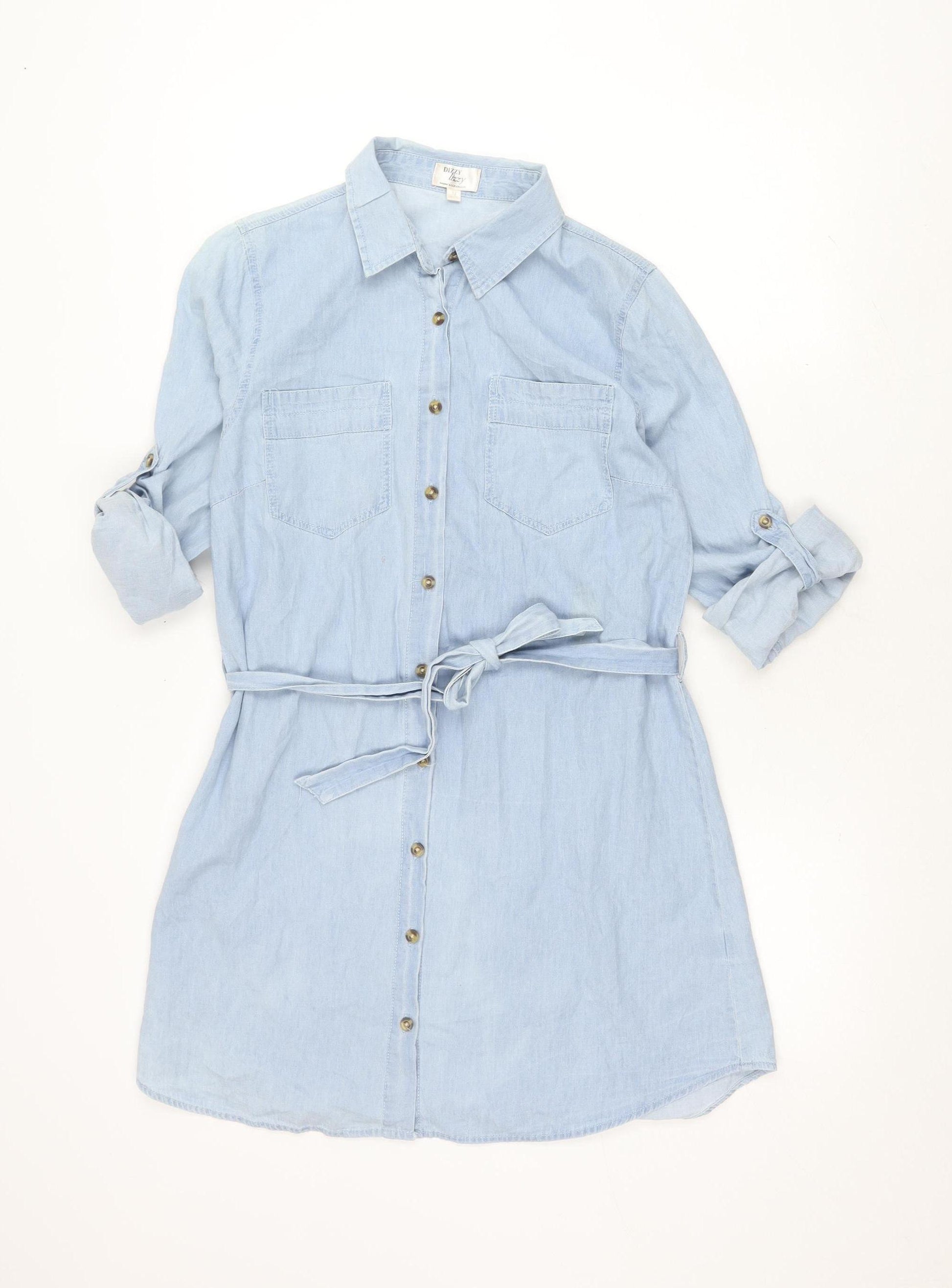 This women's casual shirt dress by Dizzy Lizzy is perfect for relaxed outings. Made from lightweight blue chambray cotton, it offers comfort and style in one. Featuring a versatile collared neckline and practical 3/4 length roll tab sleeves, this dress is easy to wear and accessorize. The button-down front and belted detail accentuate the figure, bringing a classic touch to your wardrobe. Its simple design makes it a great choice for casual occasions throughout the year. Despite minor discolouration spots, the dress remains in good condition with much wear left. Ideal for those seeking a chic, yet understated piece for everyday wear. Combine with sneakers or sandals for a complete, stylish look.