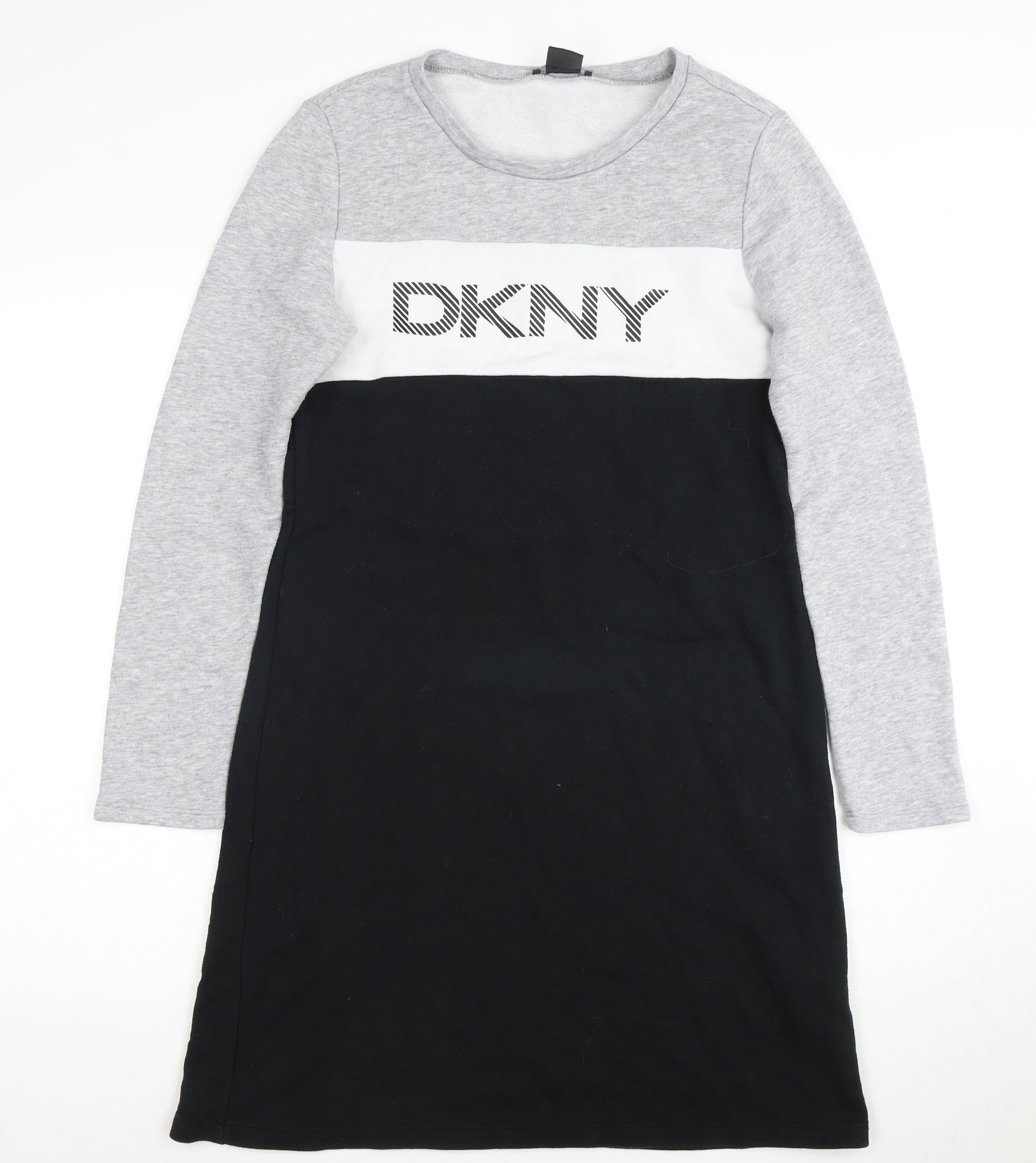 Elevate your casual wardrobe with this DKNY Women's T-Shirt Dress in a stylish grey, white, and black colourblock design. Crafted from a soft jersey fabric, it combines comfort with a sleek look. The knee-length cut and round neckline make it perfect for both autumn and winter wear, while the long sleeves provide added warmth. This dress features the iconic DKNY logo, adding a touch of brand appeal. Ideal for casual occasions, it can be dressed up or down depending on your plans. With its regular size M fit and lightweight material, this dress ensures ease of wear throughout the day. Machine washable for effortless care, it maintains its condition nature, making it a practical addition to any fashion-forward wardrobe.