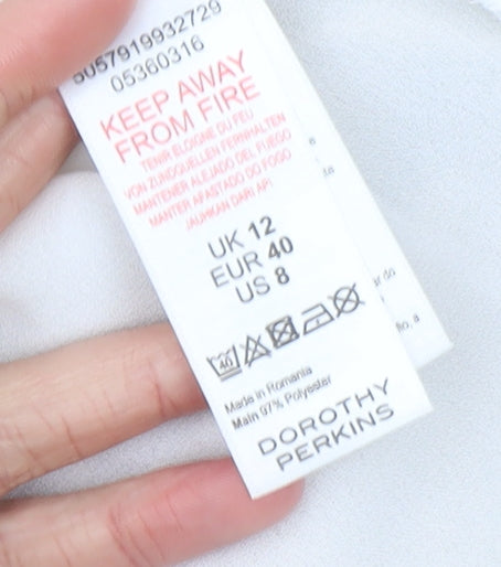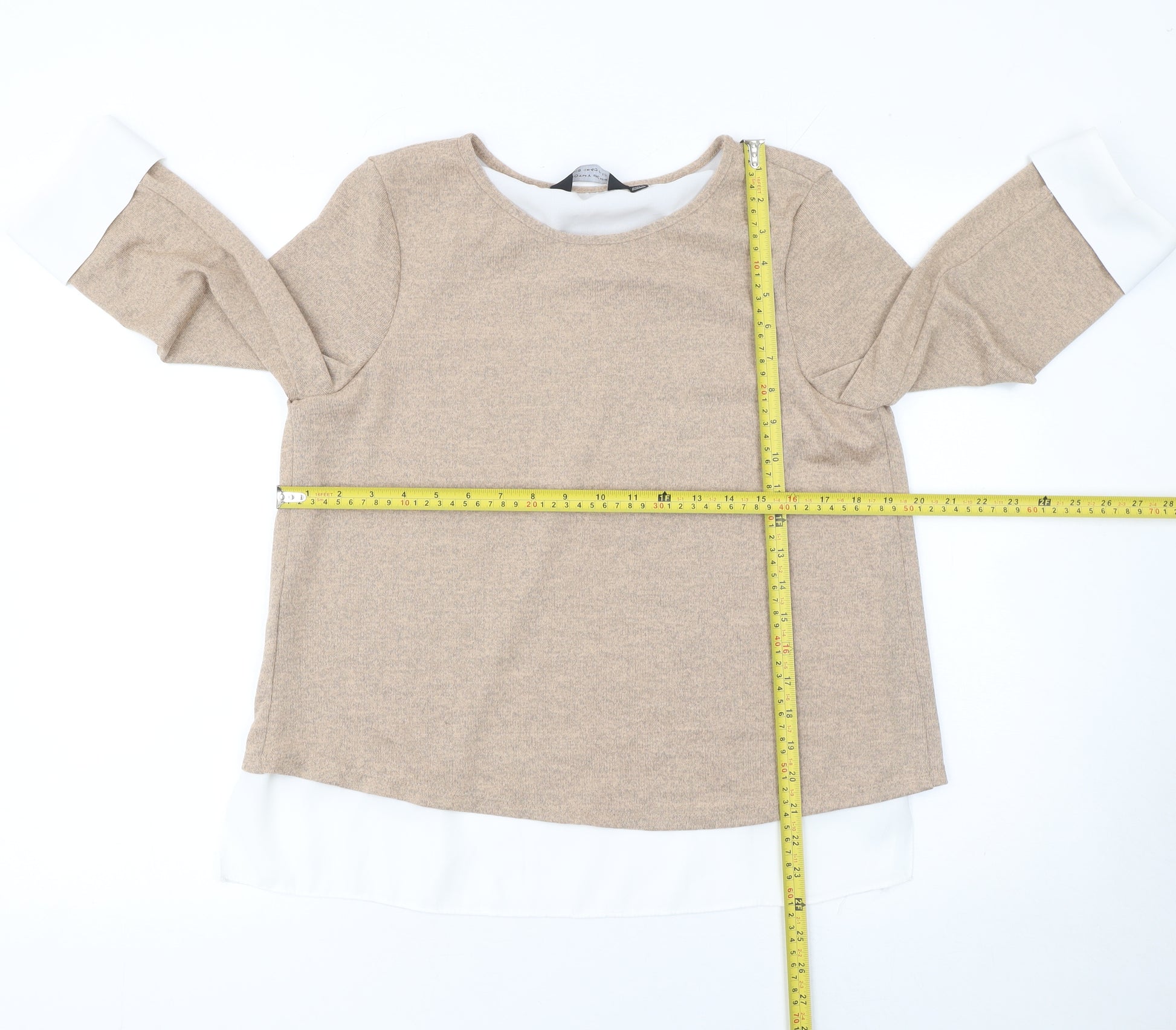 This beautiful beige pullover jumper from Dorothy Perkins is a perfect addition to your everyday wardrobe, combining casual elegance and comfort in one. Designed for women, this UK size 12 jumper features a flattering regular fit and a simple round neckline, making it easy to pair with jeans, skirts, or trousers for a laid-back yet stylish look. The 3/4 sleeves give it a relaxed, transitional appeal suitable for both spring and autumn wear. Crafted from a soft, lightweight knit fabric composed of 97% polyester and 3% elastane, it ensures comfort throughout the day while maintaining its shape and smooth texture. The blend offers a subtle stretch that complements your silhouette without feeling restrictive. The hem and cuffs are accentuated with a contrasting white trim, adding a touch of sophistication and modern style to this classic piece. Its open-back overlay design at the rear lends it a trendy, layered appearance that’s both chic and versatile. Machine washable and easy to care for, this jumper is ideal for busy lifestyles while keeping you polished at all times. Perfect for casual outings, office wear, or weekend gatherings, it embodies effortless elegance with a comfortable fit. The beige tone makes it a timeless neutral that coordinates seamlessly with various colours and patterns in your wardrobe, allowing it to transition smoothly from day to evening occasions. In excellent pre-loved condition, showing only minimal signs of wear with no visible flaws, this Dorothy Perkins piece offers great value and enduring style. Whether you’re dressing for comfort or understated charm, this jumper delivers both in equal measure. A staple piece for women who appreciate simple sophistication and practicality in their wardrobes.