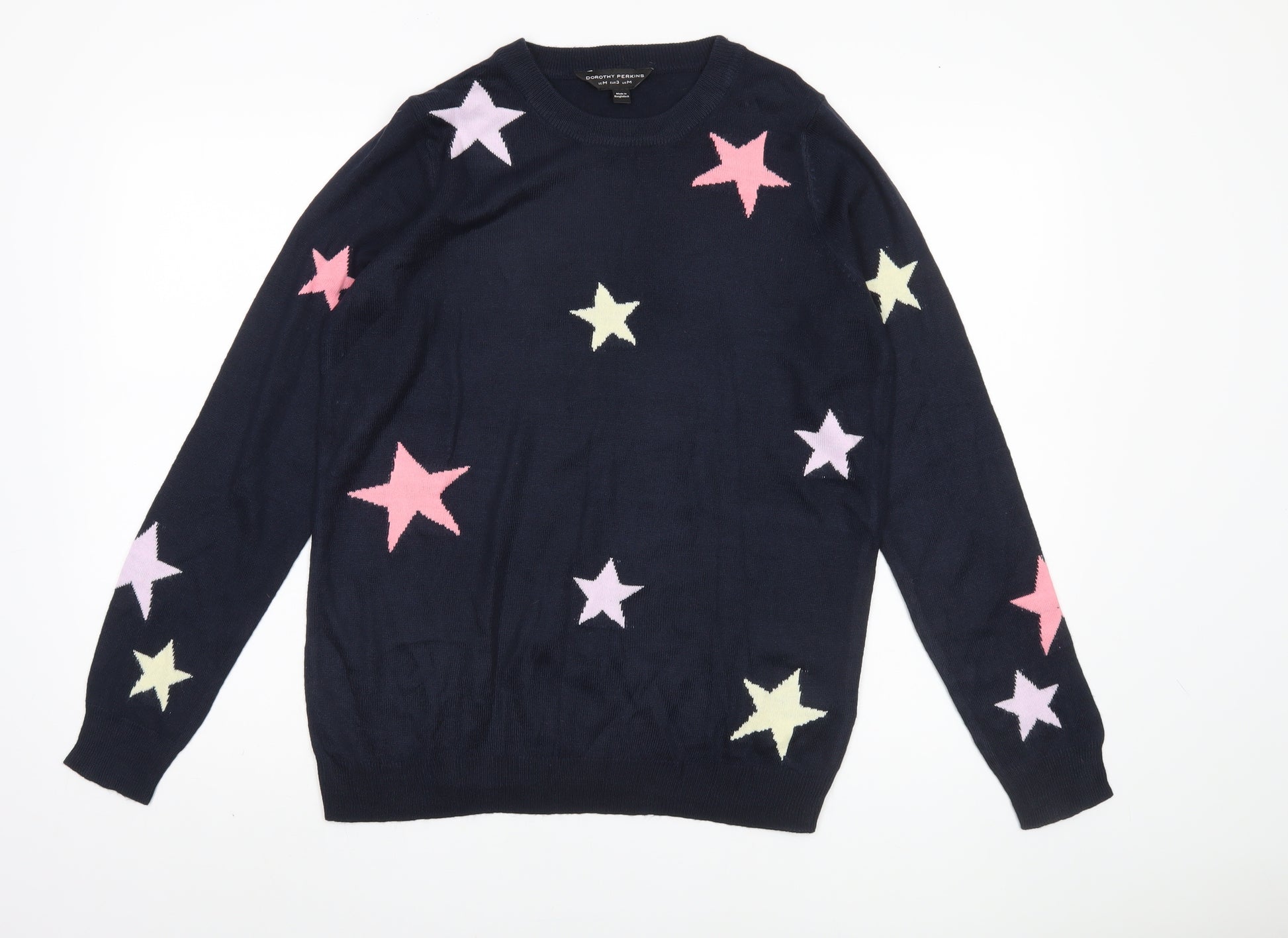 Add a touch of playful elegance to your wardrobe with this Dorothy Perkins Women's Blue Star Pullover Jumper. Designed with a classic crew neck and long sleeves, this jumper is perfect for keeping warm during the autumn and winter months. The navy blue background is adorned with charming star patterns in various shades, offering a delightful pop of colour to brighten up your everyday look. Crafted from 100% acrylic, the tight-knit fabric ensures a cozy and comfortable fit, making it ideal for all-day wear.This pullover style jumper features a regular fit, providing a relaxed yet flattering silhouette that complements any body shape. Its versatile design allows it to be dressed up or down, making it an excellent choice for casual outings or relaxed weekends at home.The jumper is machine washable, ensuring easy care and maintenance. Whether paired with jeans for a laid-back look or layered over a skirt for a more sophisticated style, this jumper is a versatile addition to any fashion-forward wardrobe.Presented in excellent condition with no visible signs of wear or damage, this stunning Dorothy Perkins jumper is a must-have for any stylish woman's collection. Whether you're treating yourself or looking for the perfect gift, this star-studded jumper will surely become a favorite.