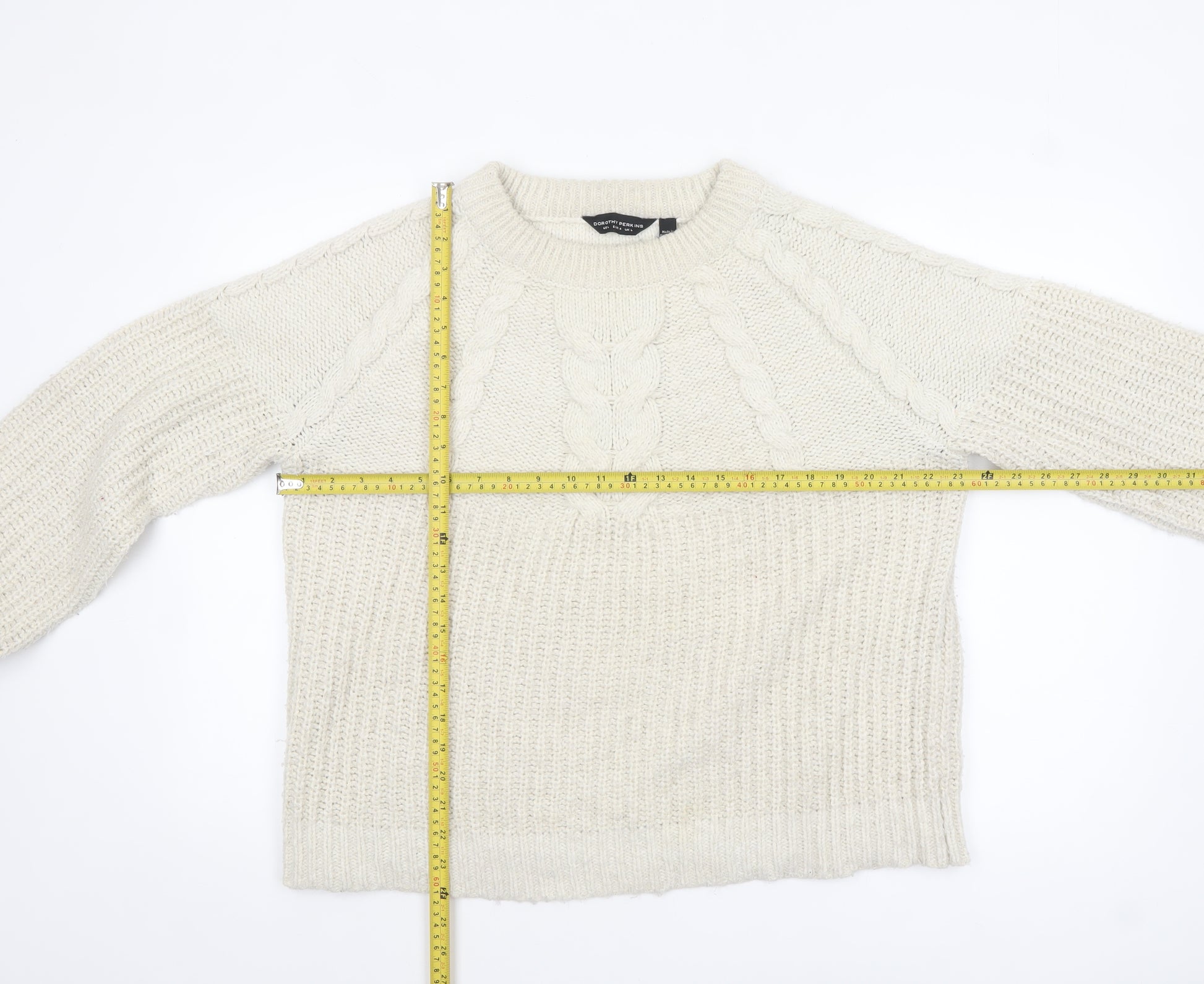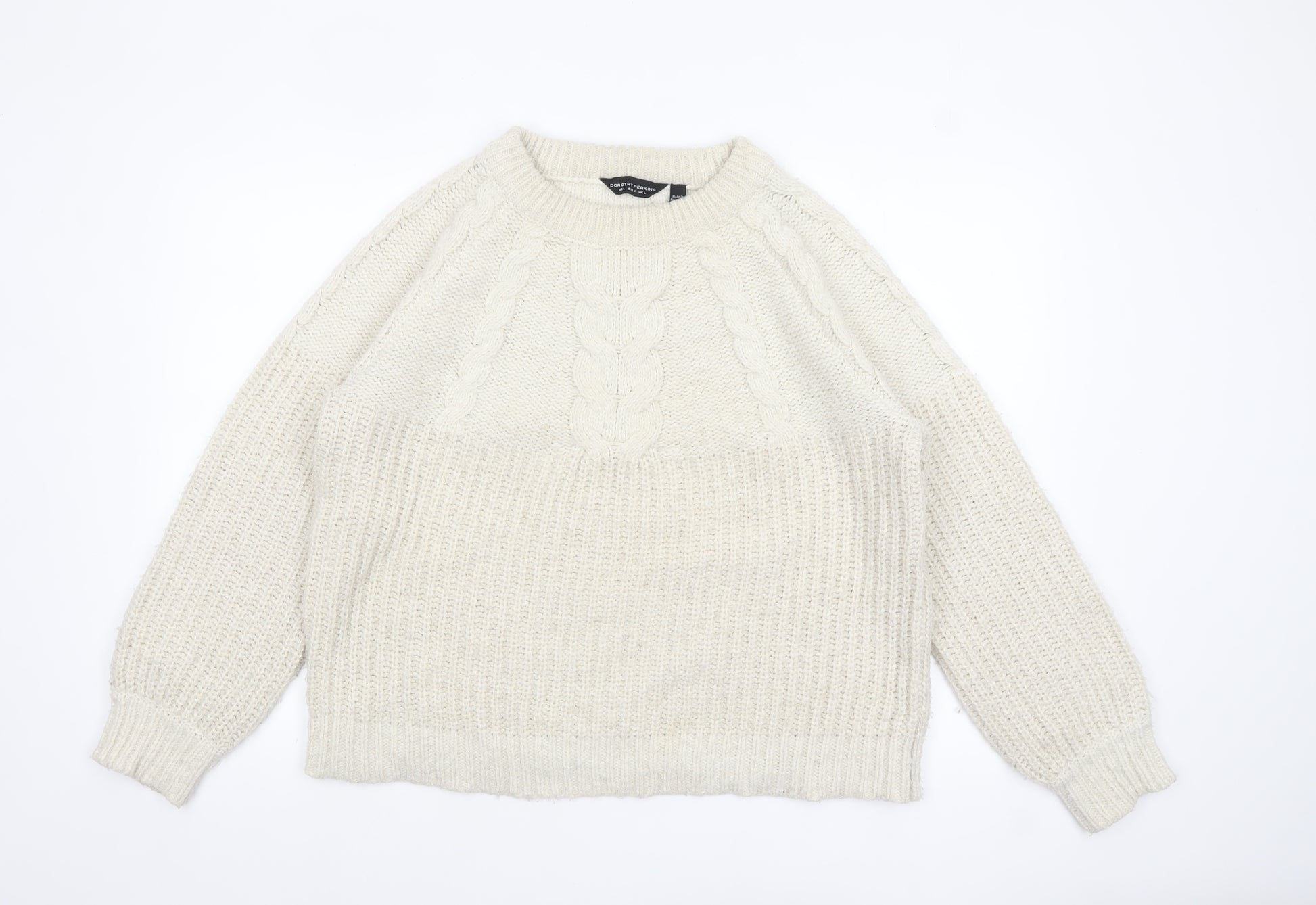 Stay cosy and stylish in this beautiful ivory cable knit jumper from Dorothy Perkins, designed for women who love classic comfort with a modern touch. Crafted from a soft and warm blend of acrylic, polyester, and metallic fibres, this pullover jumper offers both durability and a touch of subtle shimmer. The cable-knit detailing across the front adds timeless charm, while the crew neck and long raglan sleeves create a relaxed and flattering silhouette perfect for layering. The ribbed cuffs and hem ensure a snug yet flexible fit, making it ideal for everyday wear during the cooler months of autumn and winter. This Women’s Regular Fit Jumper is lightweight enough for indoor comfort while providing the warmth needed for outdoor strolls and chilly commutes. The understated ivory colour makes it wonderfully versatile, effortlessly pairing with jeans, skirts, or tailored trousers for both casual and smart-casual occasions. Machine washable and easy to care for, this jumper offers both practicality and lasting quality.Perfect for those seeking a wardrobe staple that feels as good as it looks, this Dorothy Perkins knit will become your go-to choice for comfort and effortless elegance. Whether layered under a coat for crisp winter days or worn on its own in early autumn, it brings both warmth and soft sophistication to your ensemble. Elevate your seasonal knitwear collection with this chic, comfortable classic—a jumper that’s designed to last year after year.